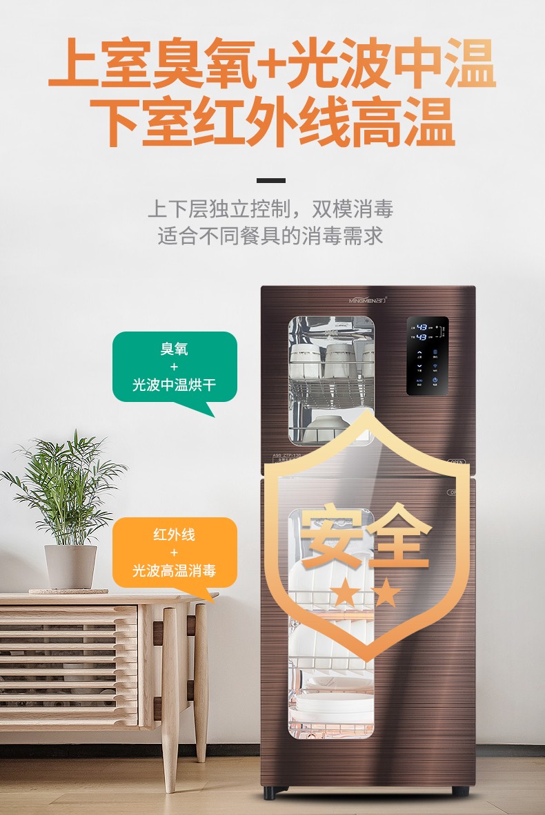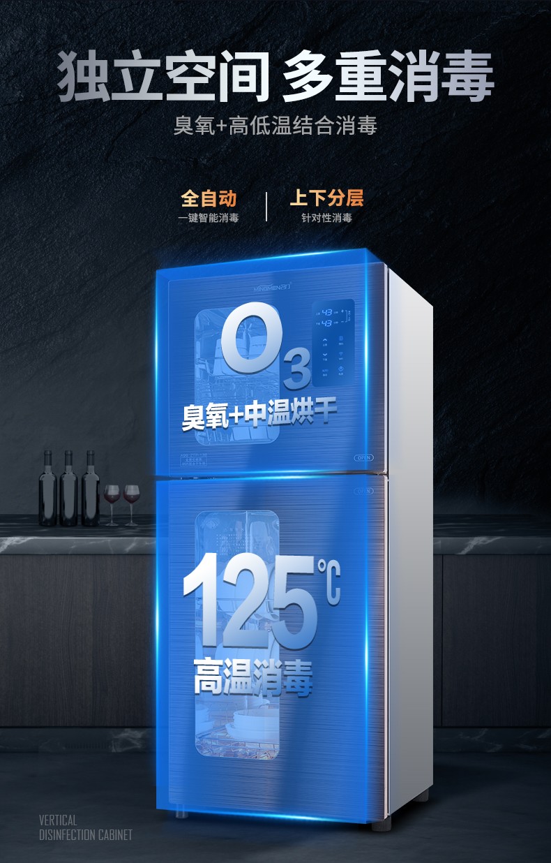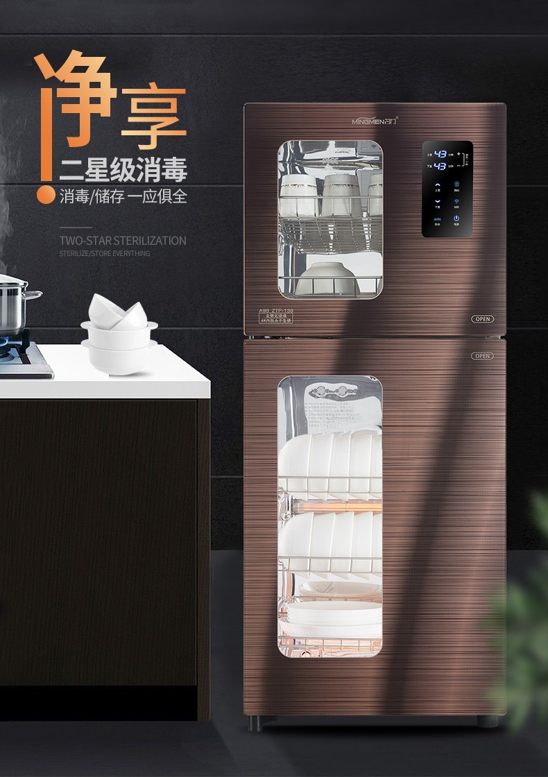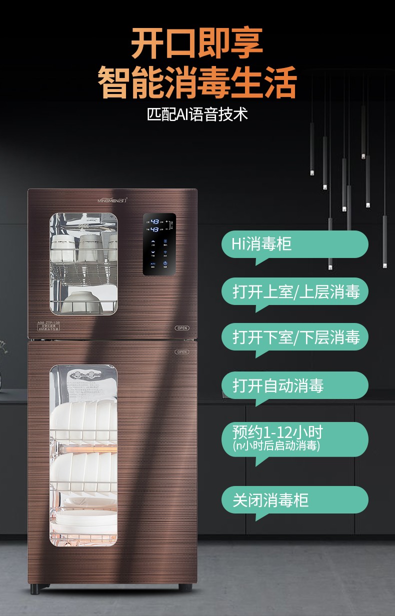 380 升名门消毒柜 -A98 WIFI语音控制 全钢化玻璃 上室臭氧光波 下室红外线高温580*490*1610(宽*深*高)
