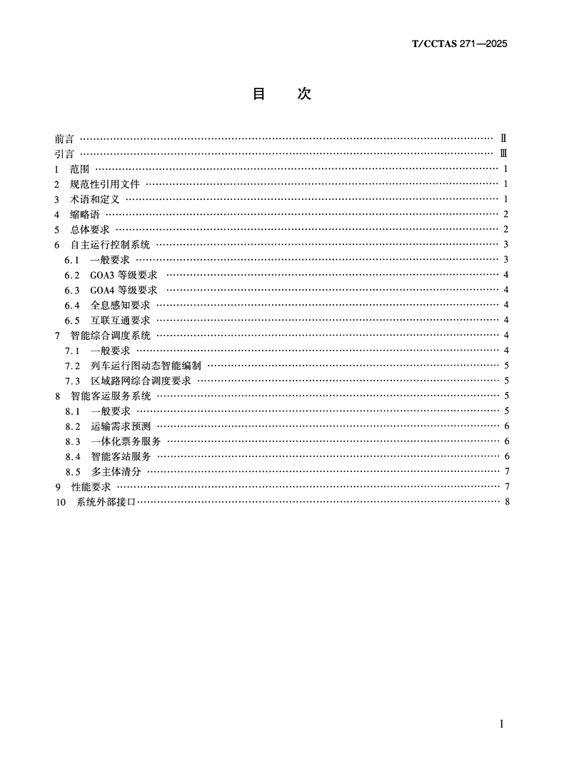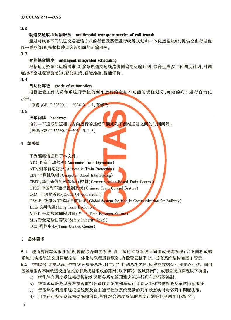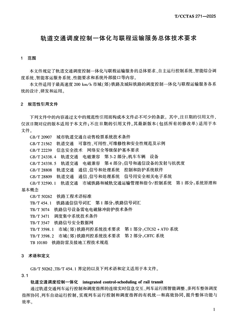 书名:轨道交通调度控制一体化与联程运输服务总体技术要求T/CCTAS 271—2025