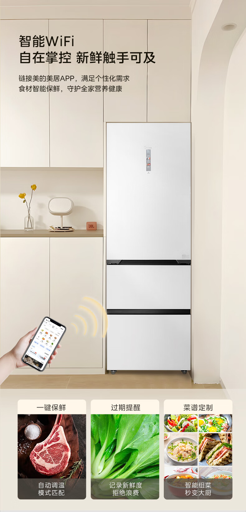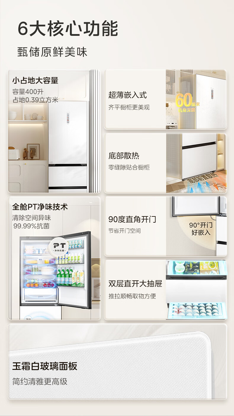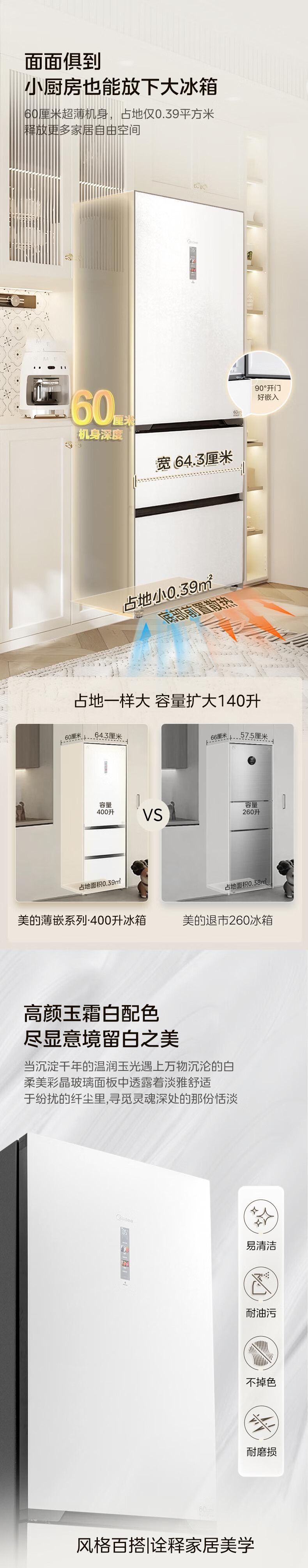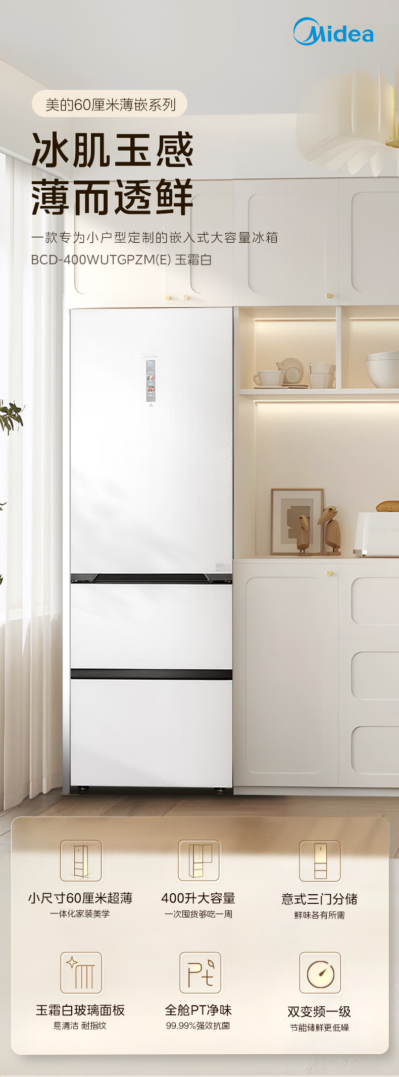 美的(Midea)60cm薄系列400升意式多门三门超薄可嵌入家用智能电冰箱BCD-400WUTGPZM(E)玉霜白