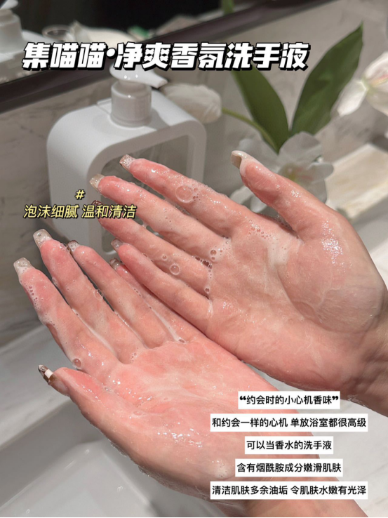 作为一个有点小洁癖的人 洗手的频率也更高了 皂基的真的很伤手 洗完很干容易起皮 集喵喵·净爽香氛洗手液 很温和,洗完手也不会很干 带着淡淡的清香的清香 清洁效果很好