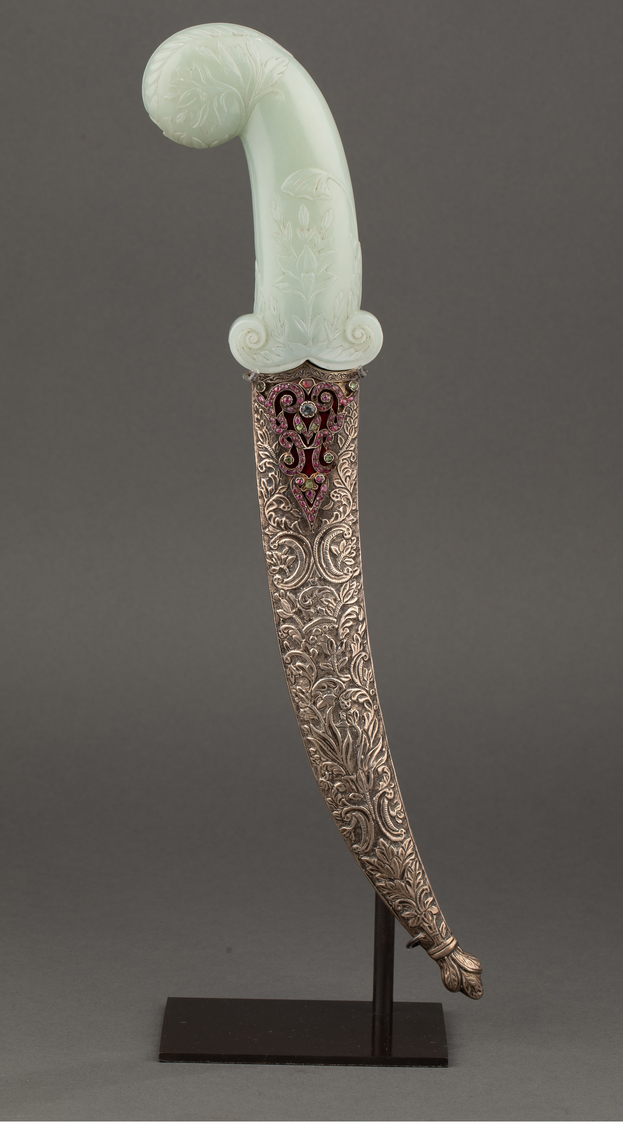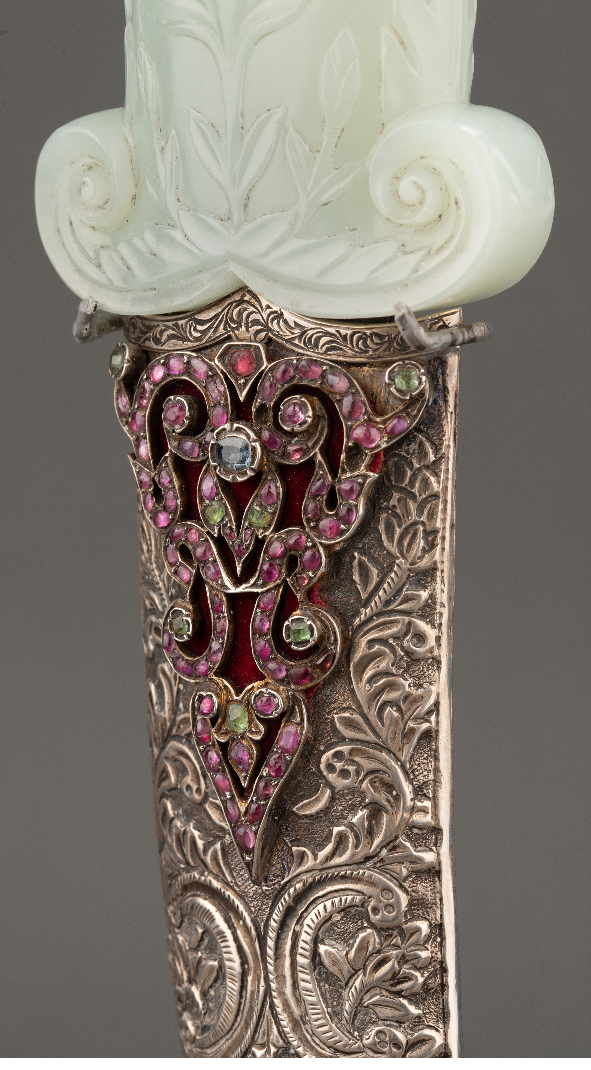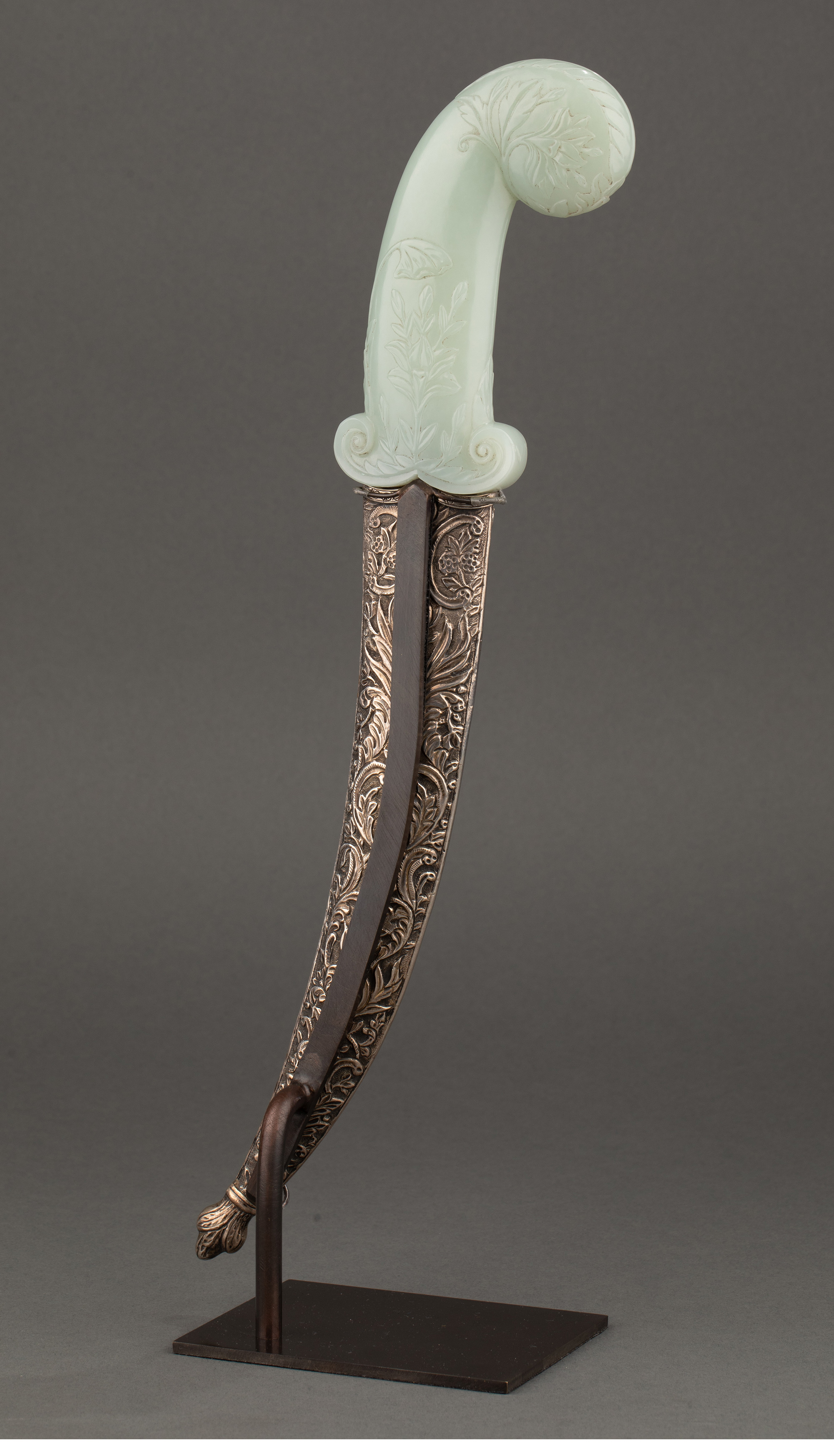 19世纪奥斯曼帝国出品玉石雕花手柄花卉卷叶纹金银镶嵌半宝石装饰匕首【未开刃】