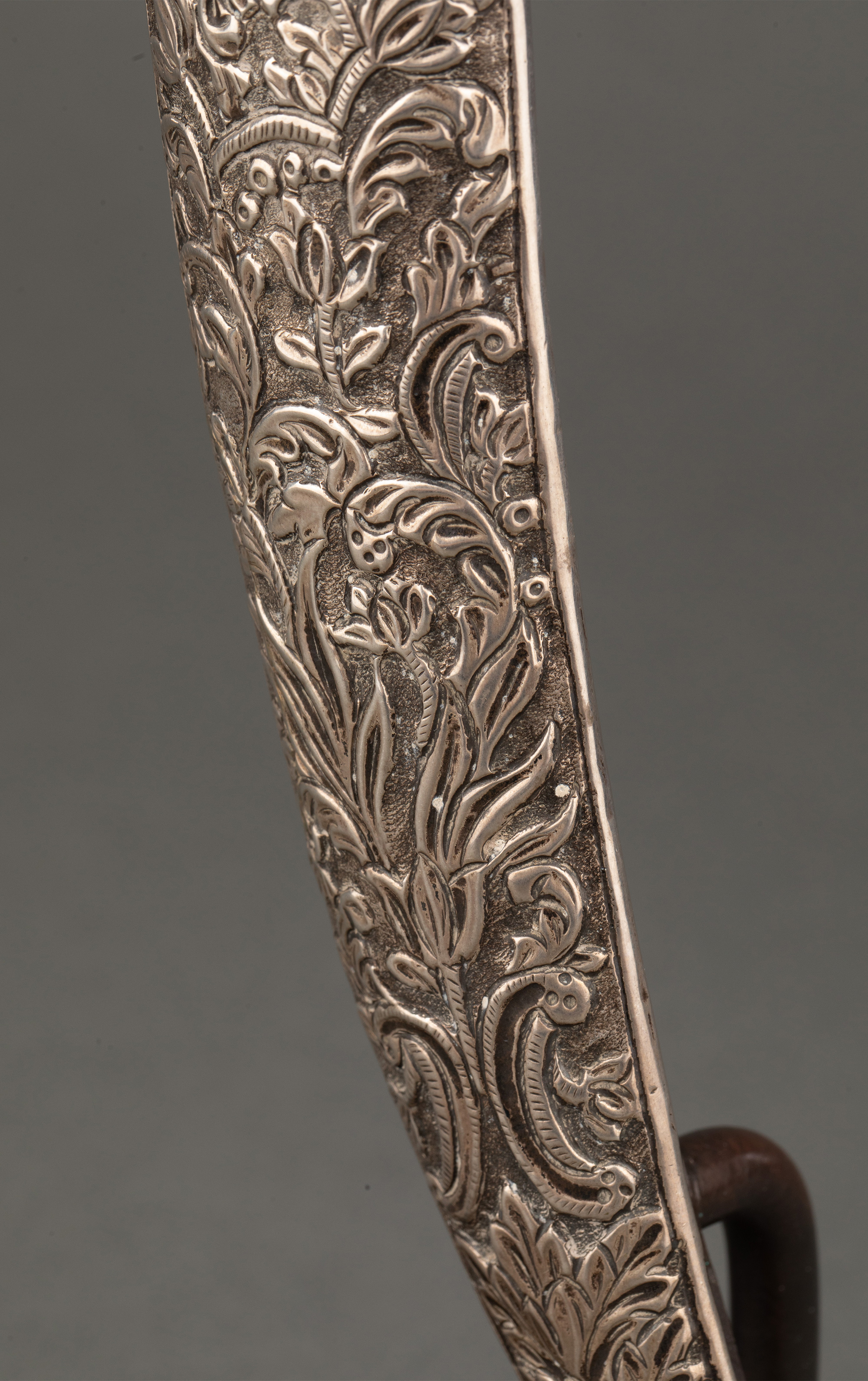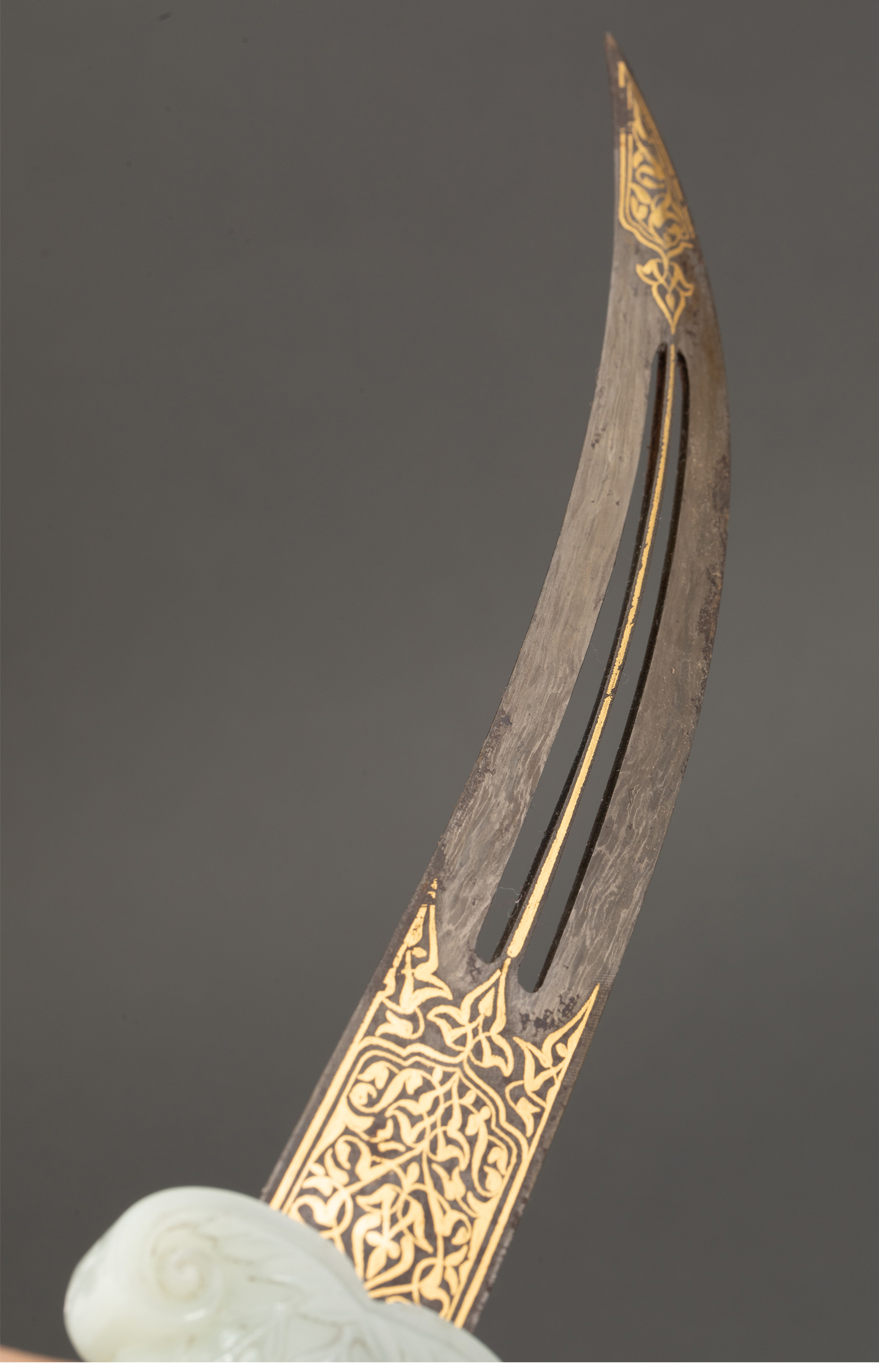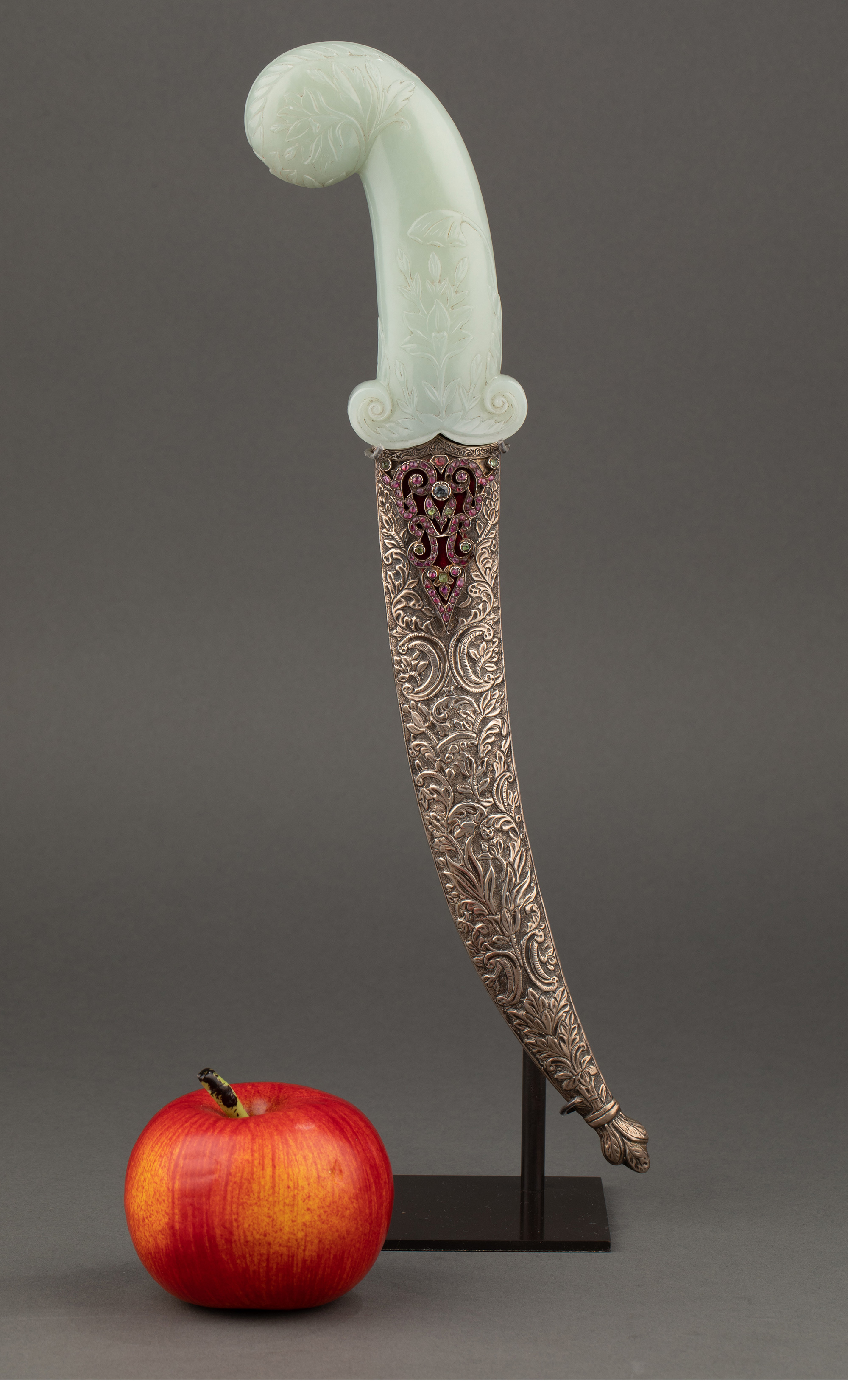 19世纪奥斯曼帝国出品玉石雕花手柄花卉卷叶纹金银镶嵌半宝石装饰匕首【未开刃】