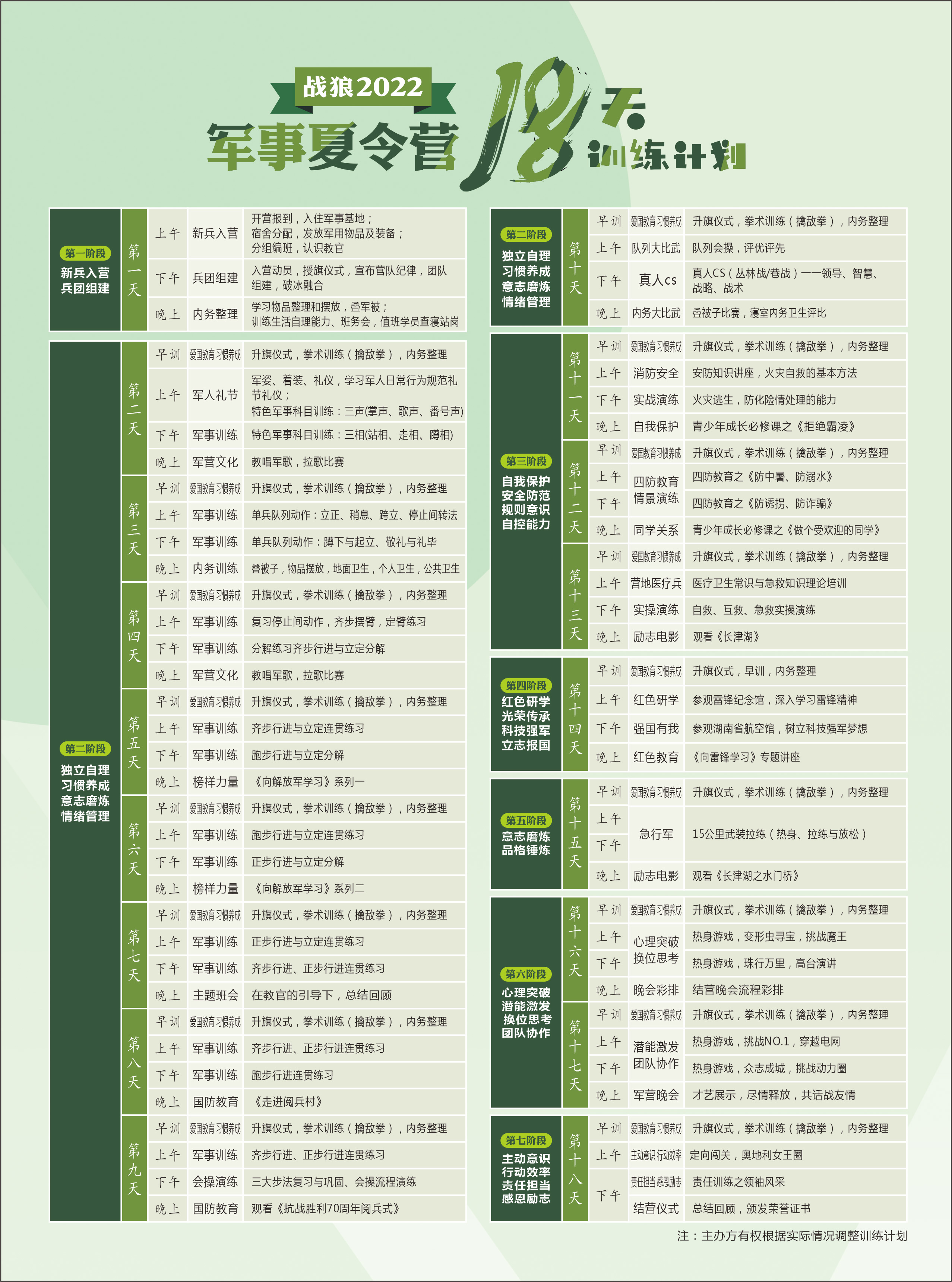 夏令营活动采用全封闭军事化管理,营员统一食宿,活动期间不安排家长探视;