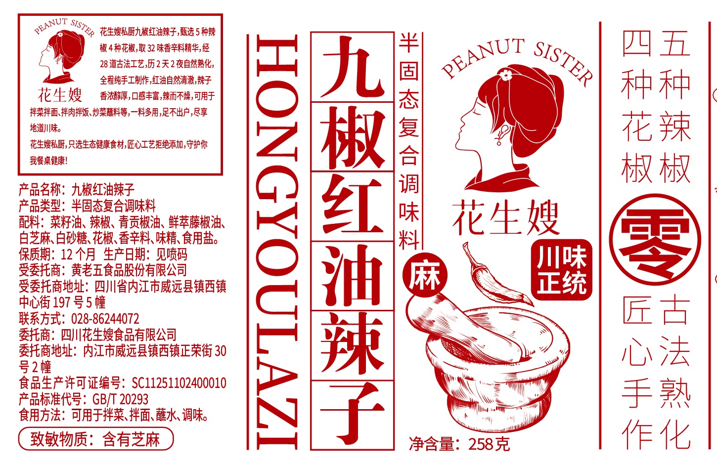 花生嫂选择以“七星椒”、灯笼椒、大条子椒为代表的5种辣椒,经川菜大师亲自指导配比,去腥增香、色度调剂、辣味复合,各司其职,多元化的辣味将5种辣椒的个性尽收其中,使得红油辣子的口感均衡,滋味浓郁,色泽诱人,欲罢不能。