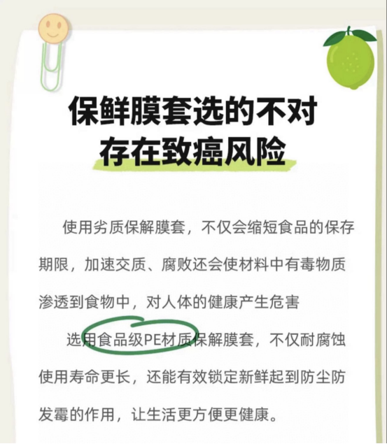 食品级PE材质,健康安全 作为与食品直接接触的产品 材质的选择尤为重要 免撕抗菌保鲜膜套采用食品级PE材质 通过高压工艺处理,使其质地高清透亮 相比普通保鲜膜,它更加安全环保 不会释放有害物质,入口更加安心