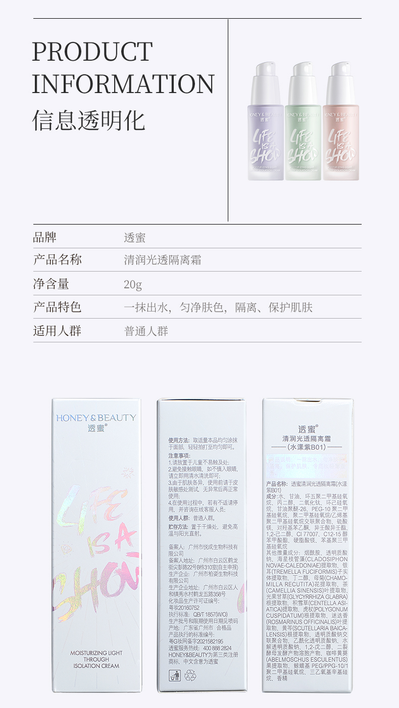 【蜜家特惠丨买1送1】[买就送爆水珠隔离霜1瓶]透蜜 清润光透隔离霜20g 妆前乳素三合一保湿隔离(新旧款随机发货)