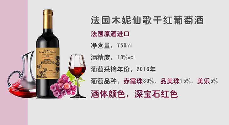 组件:木妮仙歌干红葡萄酒750ml/瓶,共18瓶,加赠路易霍格XO白兰地两瓶