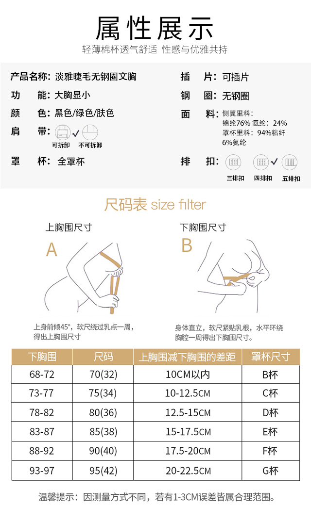大胸显小全罩杯调整型文胸收副乳,防下垂胸罩。淡雅睫毛无钢圈文胸