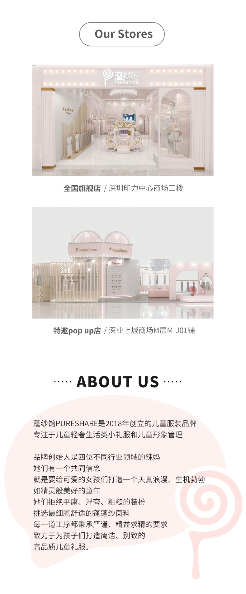 - PureShare蓬纱馆,2018年创立的儿童服装品牌,专注于儿童轻奢生活类小礼服,主张“让孩子做最独特的自己”的品牌理念,为孩子们提供时尚简洁、优雅而又不失童真的生活类礼服。