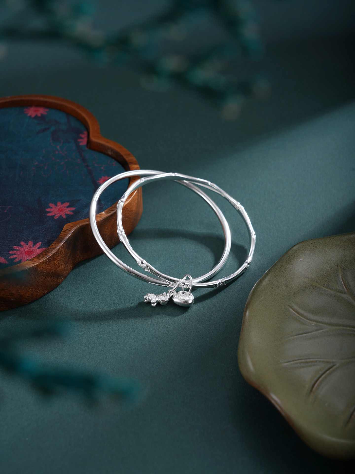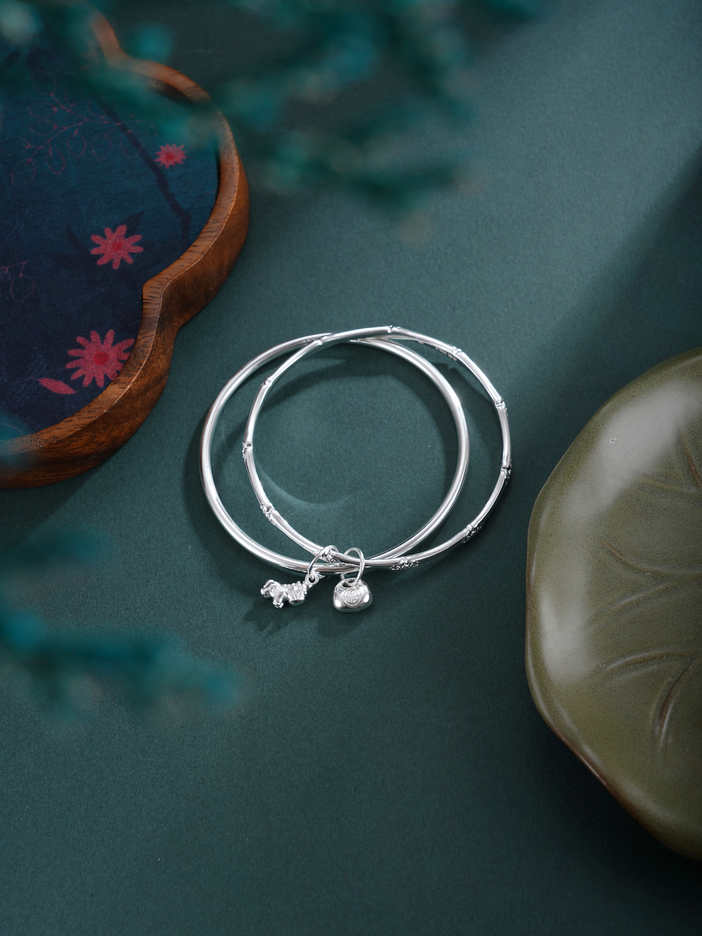 【寓意】:纯银双圈手镯,小马点缀,喻示奔腾好运,福袋点缀,象征满载吉祥财气。整体寓意福马引路,聚八方之宝。