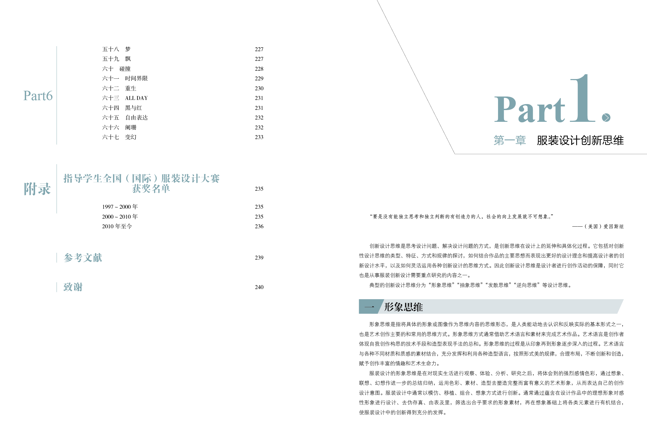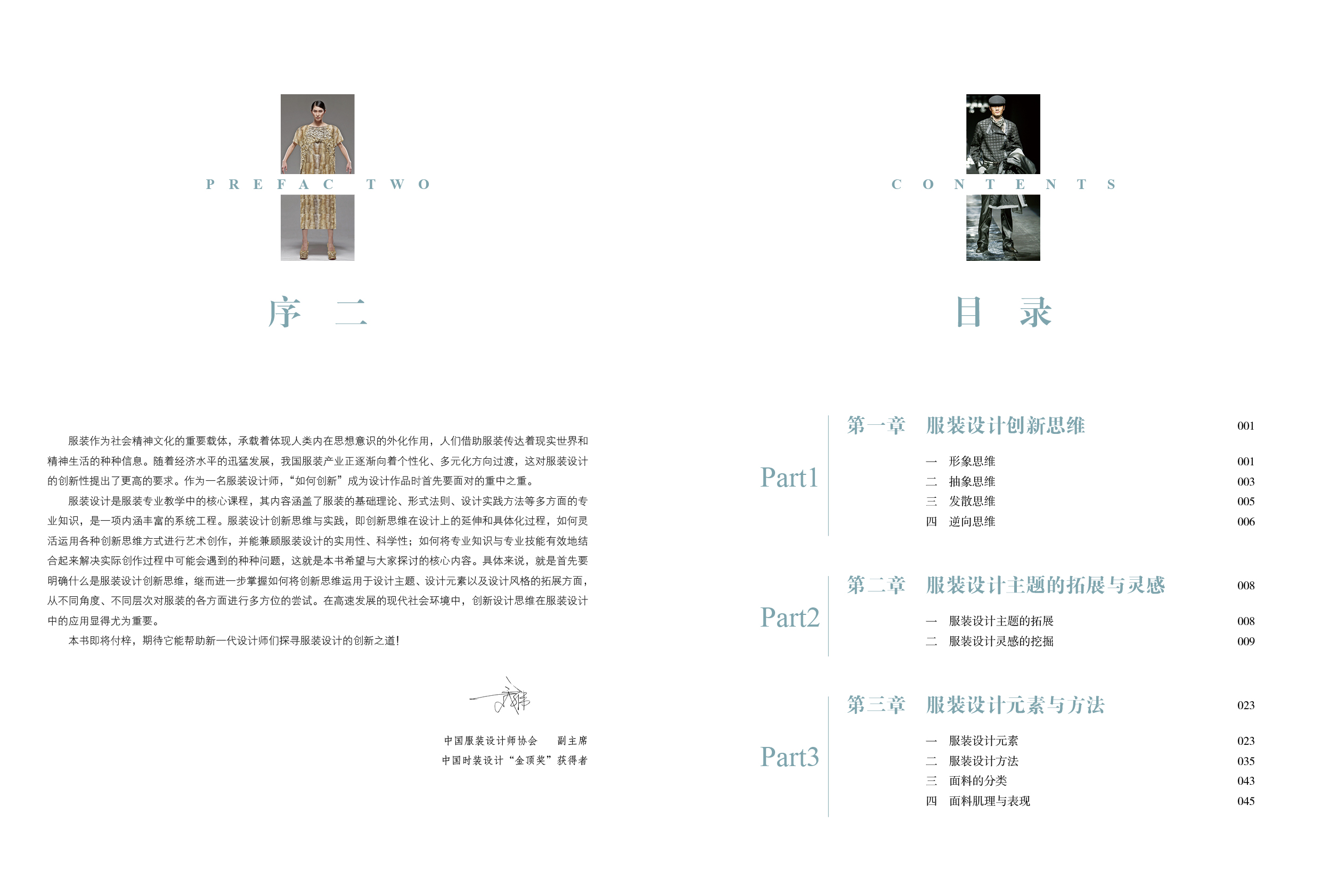 服装创新设计从思维到实践的全环节展开,括灵感图、设计定位、设计元素、设计思维的表现、材质、造型、设计思维的实践七个章节。《服装创新设计:思维与实践》内容充满实际操作的指导与相应大赛获奖作品的案例,对学生的创新思维具有引导并进行实际应用的价值。