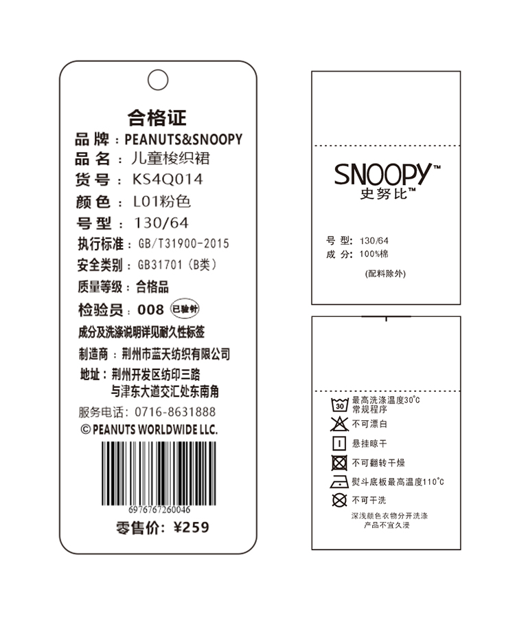 【100%棉】【100-130】【史努比】女童夏季甜美纯棉连衣裙