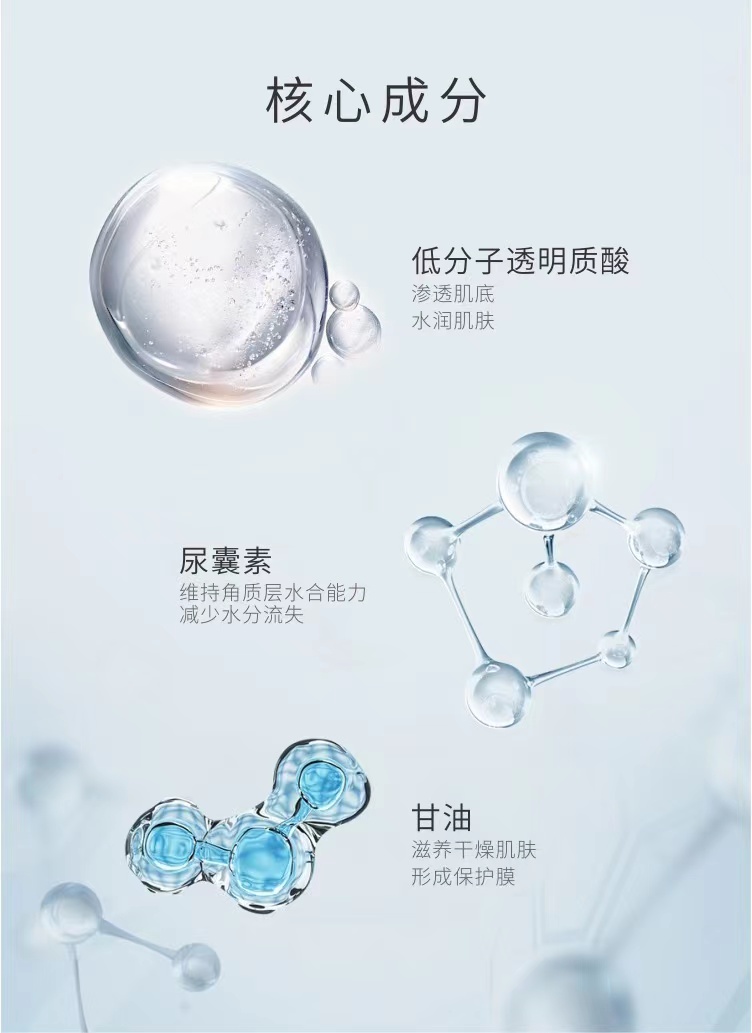 【作 用】 保湿,补水,卓越的锁水和吸水功能很好地修护缺水性皮肤和衰老性皮肤,有效改善皮肤缺水、干燥、松弛等问题,使用后皮肤呈现润泽而有弹性。