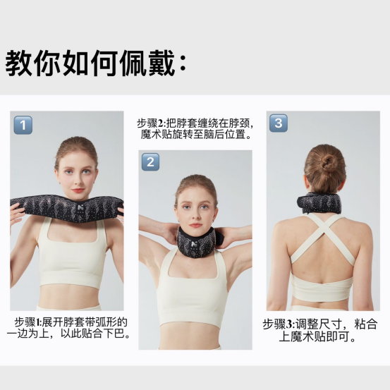 三步简单佩戴 步骤1:展开脖套带弧形的一边为上,以此贴合下巴 步骤2:把脖套缠绕在脖颈魔术贴旋转至脑后位置 步骤3:调整尺寸,粘合上魔术贴即可