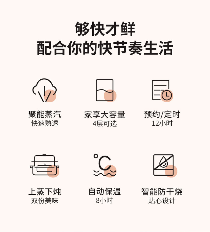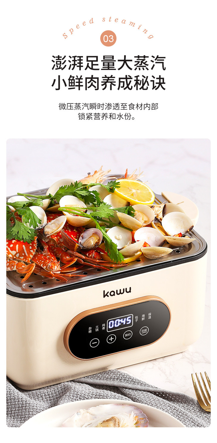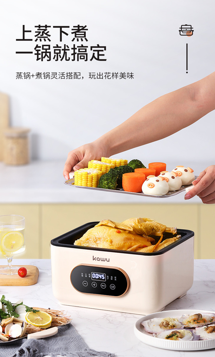 美好细节,十分贴心! ⭐防干烧保护,缺水自动停止工作; ⭐电蒸锅全景透明可视,可清晰观察烹饪状态; ⭐防烫提手设计,轻松提取不烫手。