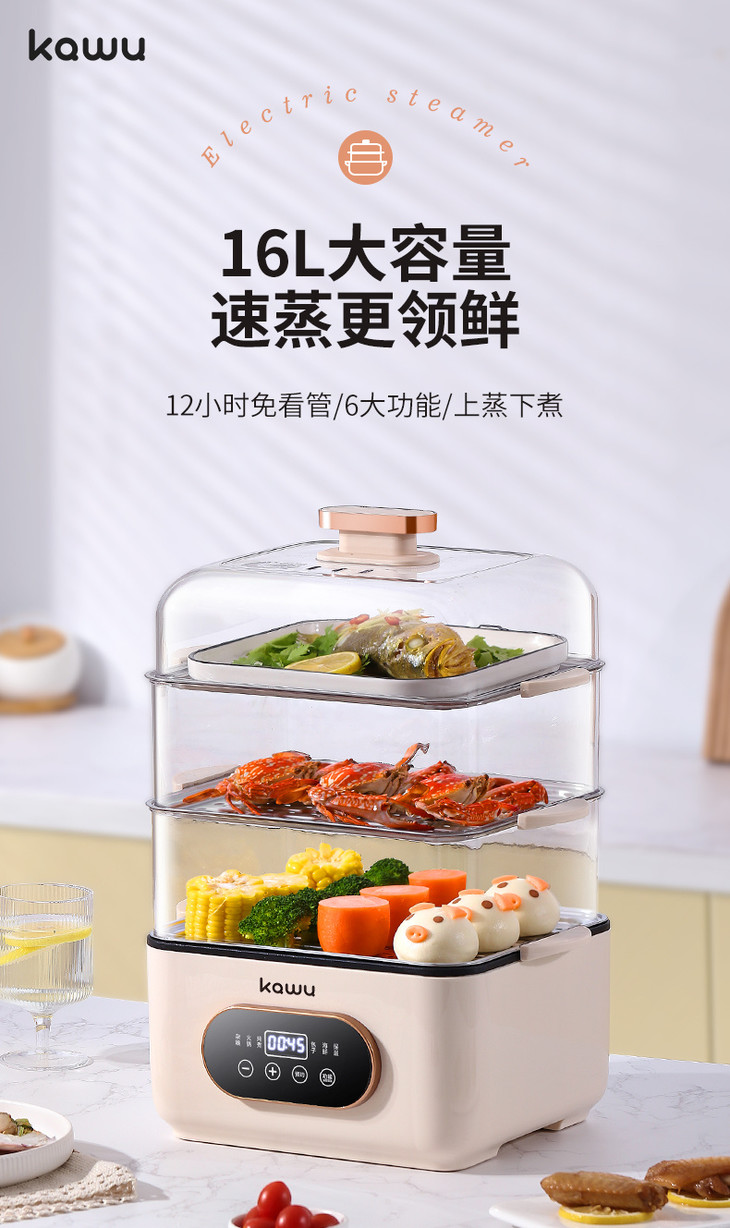 姐妹们,又菜又爱吃,是什么样的体验? 以前进厨房我是手忙脚乱的小迷糊! - 但自从入手了这款厨房神器「卡屋电蒸锅」 谁都拦不住我的厨艺大展示 我感觉自己是个“蒸”界李小龙了!🥊 -- 而且,它还是个隐藏的“大容量吃货” 16升大容量,晚上一家3口的晚餐,一锅搞定! - 不管是想蒸条大鱼庆祝,还是来几个精致小菜 它都能轻松拿捏,感觉我的厨艺都跟着“膨胀”了呢~ - 特别是聚能环加热技术,1500w大功率一开 快速出蒸汽,锁住食材鲜美原汁 - 自带6大预设菜单,为厨房小白量身定制 杂粮、火锅、海鲜、包子...一键搞定 连炖煮、保温、预约都齐活了 早上出门前预约个粥,下班回家就能喝到暖胃好粥🥣,幸福感爆棚!