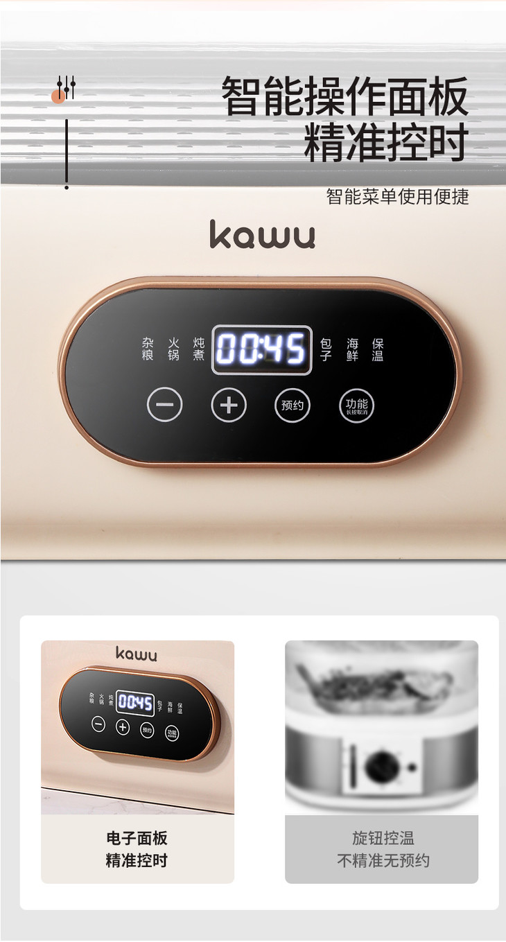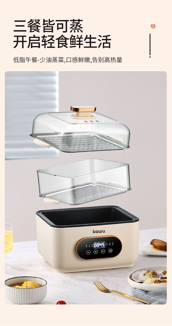 特点: ✅12小时智能预约,帮你轻松搞定早、晚餐; ✅三层大容量,满足一家人的饮食需求; ✅透明可查看,可以随时观察食物的烹饪状态; ✅六大预设功能,帮你轻松搞定各种美食; ✅智能触控面板,简单容易操作。