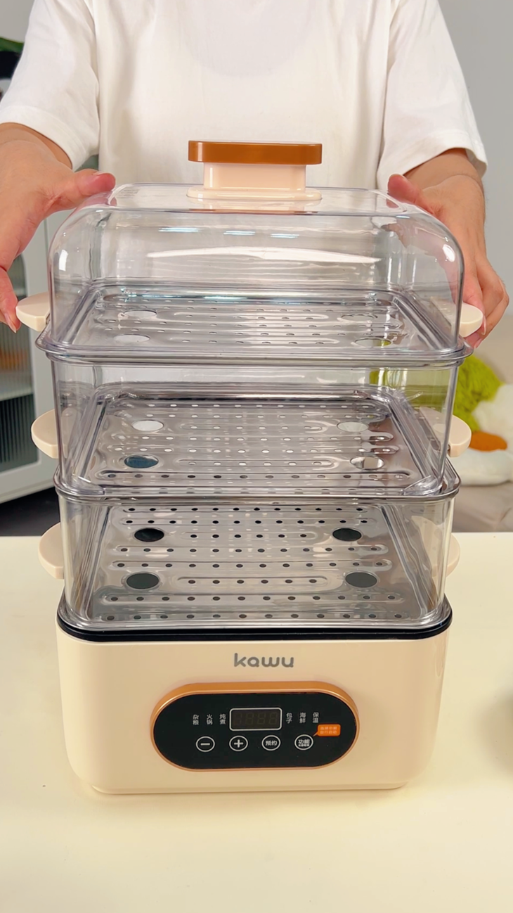 之前也买过小蒸锅,只有一层,不同种类的食物放在一起蒸会串味,分开蒸就很浪费时间…… 这款电蒸锅足足有三层呢,蒸鸡蛋、蒸海鲜、蒸肉类、蒸面食都非常方便🤗 热菜、蒸菜也可以同时进行哦,再也不需要担心串味的问题啦🉑