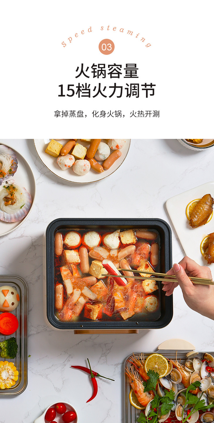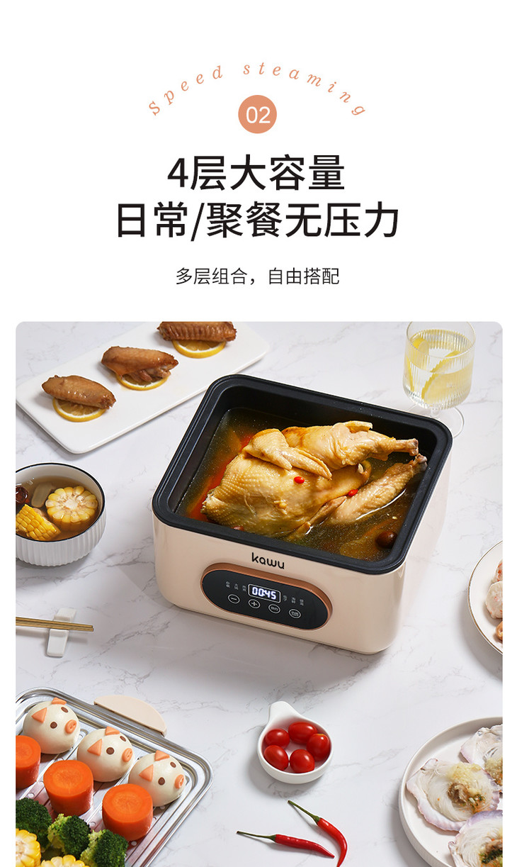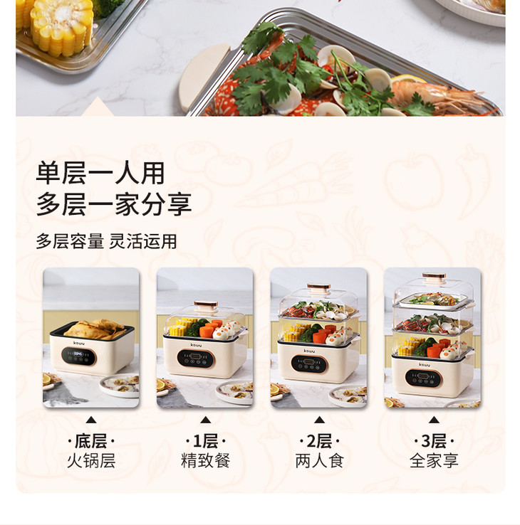 四层巨无霸大容量,下层蒸海鲜、 中层蒸一条鱼、 上层蒸蔬菜 丰富的早\午\晚餐就出来了,火锅层还可以涮火锅 而且原汁原味,保留了食材的营养价值,一份时间三份美味,大大的提高了时间效率💌