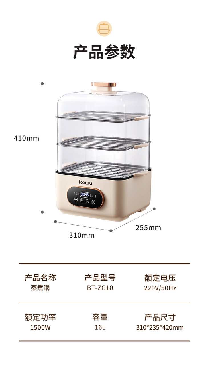 ▲名 称:卡屋多功能电蒸锅(三层) ▲容 量:16L ▲材质:PP材质,食品级蒸层 ▲功能:蒸鱼、蒸海鲜、蒸包子、蒸蔬菜、煮火锅、炒菜等 ▲产品型号:BT-ZG10 ▲额定功率:1500W ▲额定电源:220V~50Hz ▲产品尺寸:310*235*420mm