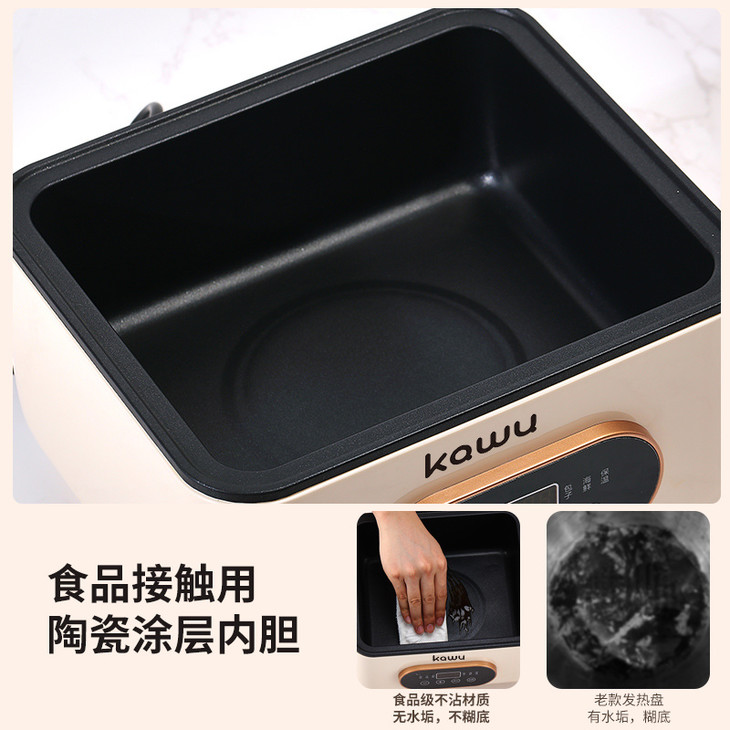 注意事项: 1、1小时内水量不少于锅内高度四分之一,根据所需时间适当增加。 2、使用时,记得盖好盖子,不同食材所需时间不同,详情请看说明书。 3、由于蒸架是不锈钢的,清洗时,需注意,防止划伤,尽量使用抹布清洗。 4、防干烧是一个安全防护功能,一旦使用对机器有不可逆的破坏,使用时还是需要看管,不能任由其启动防干烧功能。 5、底部的不粘涂层应选用硅胶铲子、木铲子,减少摩擦是硬道理,千万不能用铁铲啊,应用海绵或柔软的洗碗布清洗,减少摩擦。切勿用钢丝球、硬的百洁布、棕毛刷等。