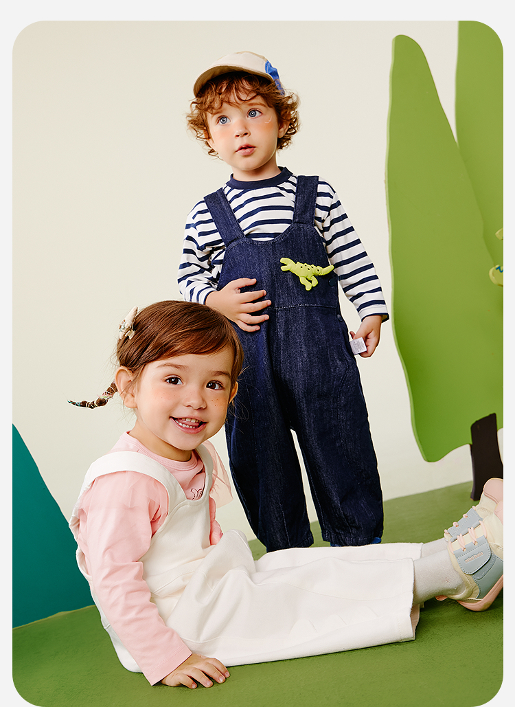 迷你巴拉男女童背带裤套装萌趣可爱长袖纯棉T恤软牛仔两件套