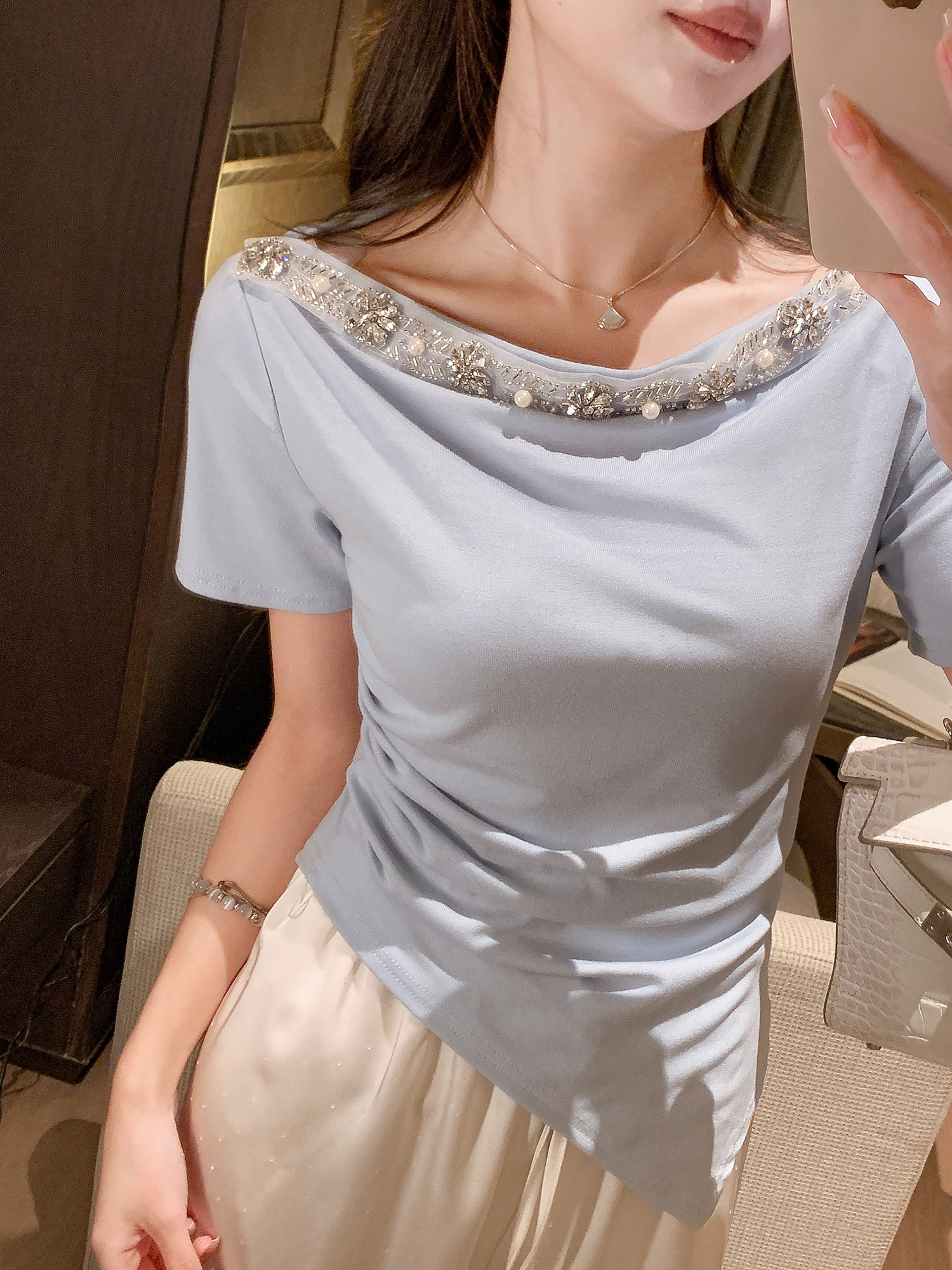 张心子【心动记号】露肩镶钻气质显瘦不规则上衣 U2507038