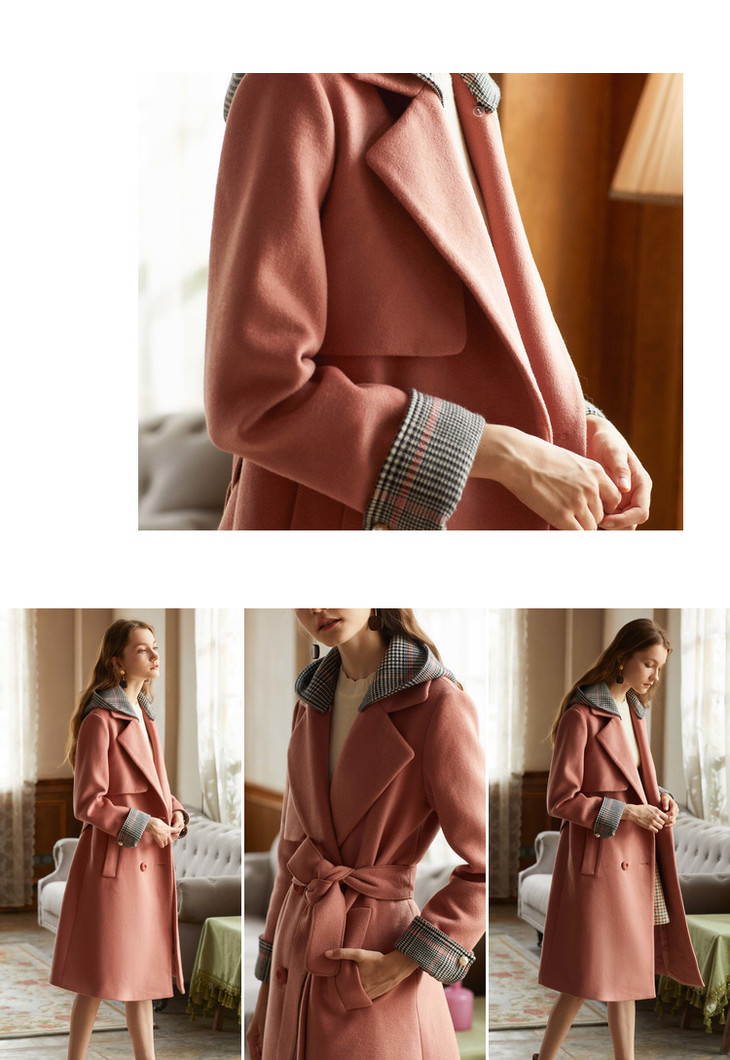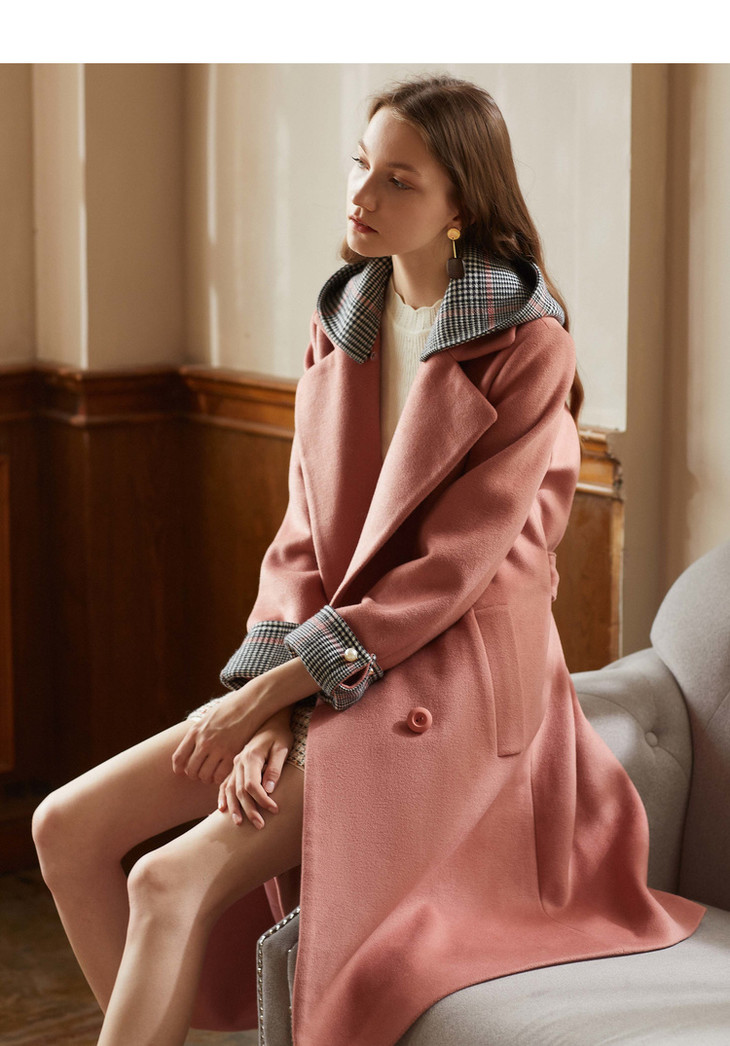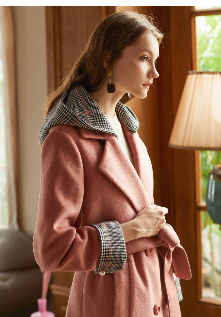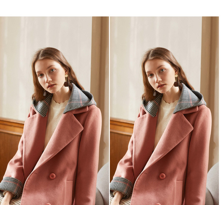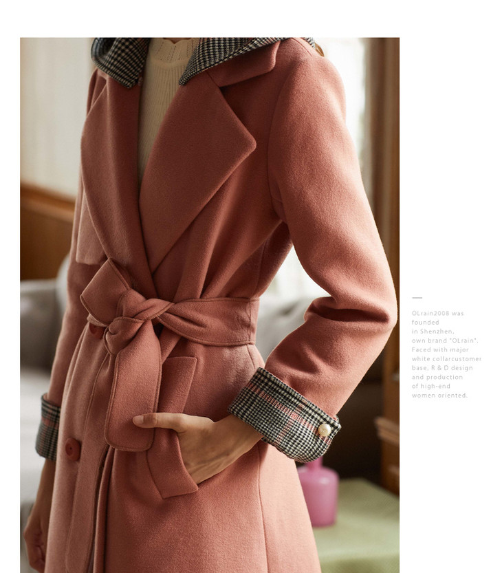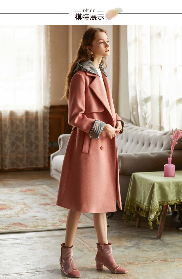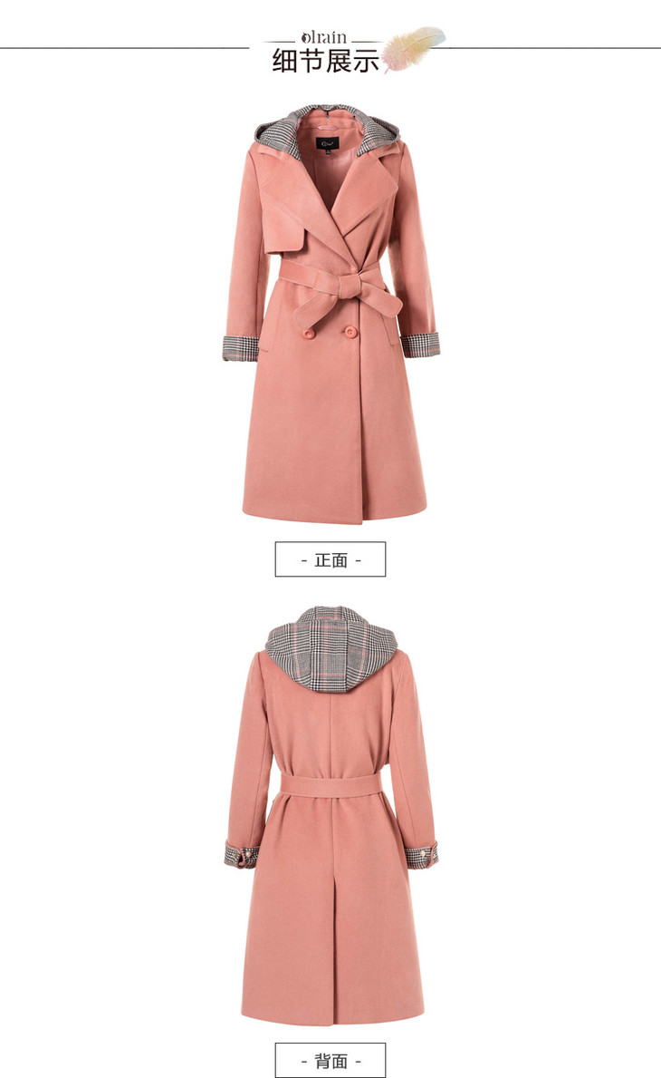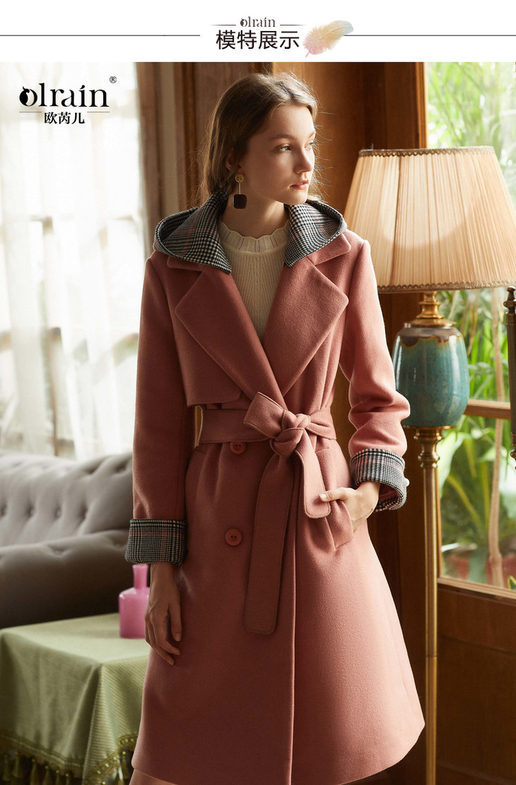 欧芮儿2018冬款女收腰格纹连帽长袖毛呢外套女长款过膝呢大衣