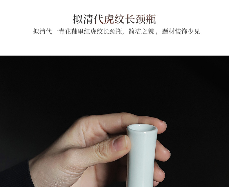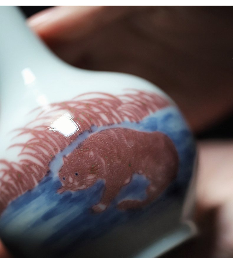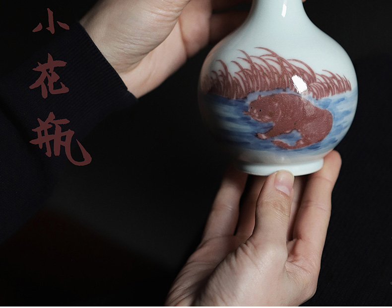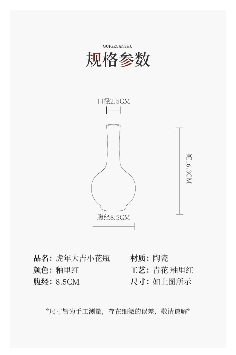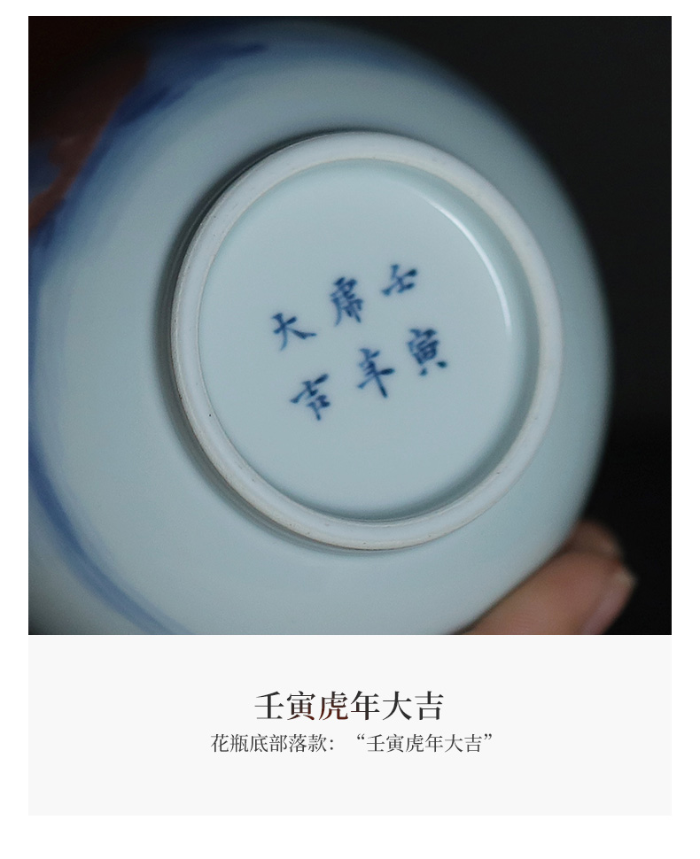 景德镇忘言造物新年手绘青花釉里红壬寅虎年大吉小花瓶赏瓶摆件 口径2.5cm 高16.3cm 腹径8.5cm