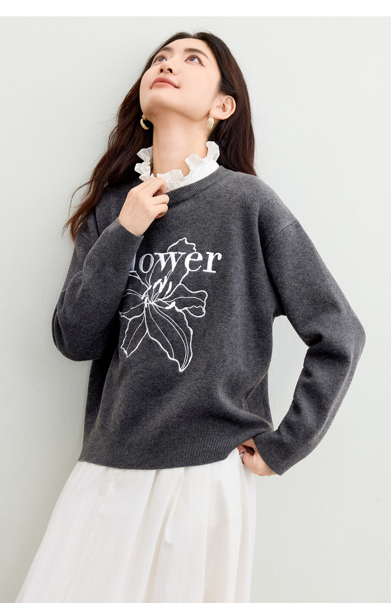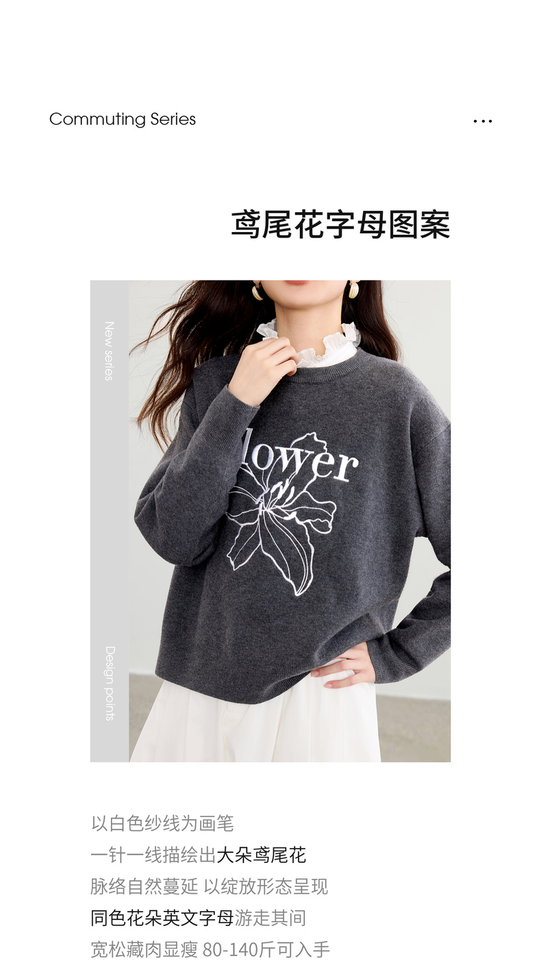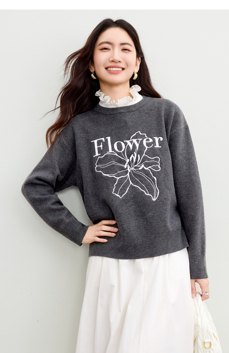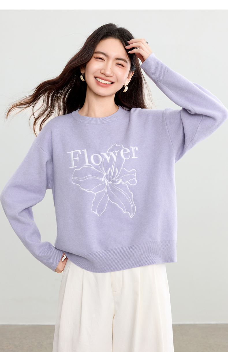 【内购】【鸢尾花】简约通勤圆领撞色字母花卉绣花宽松落肩袖软糯弹力毛衣-W53EE3374