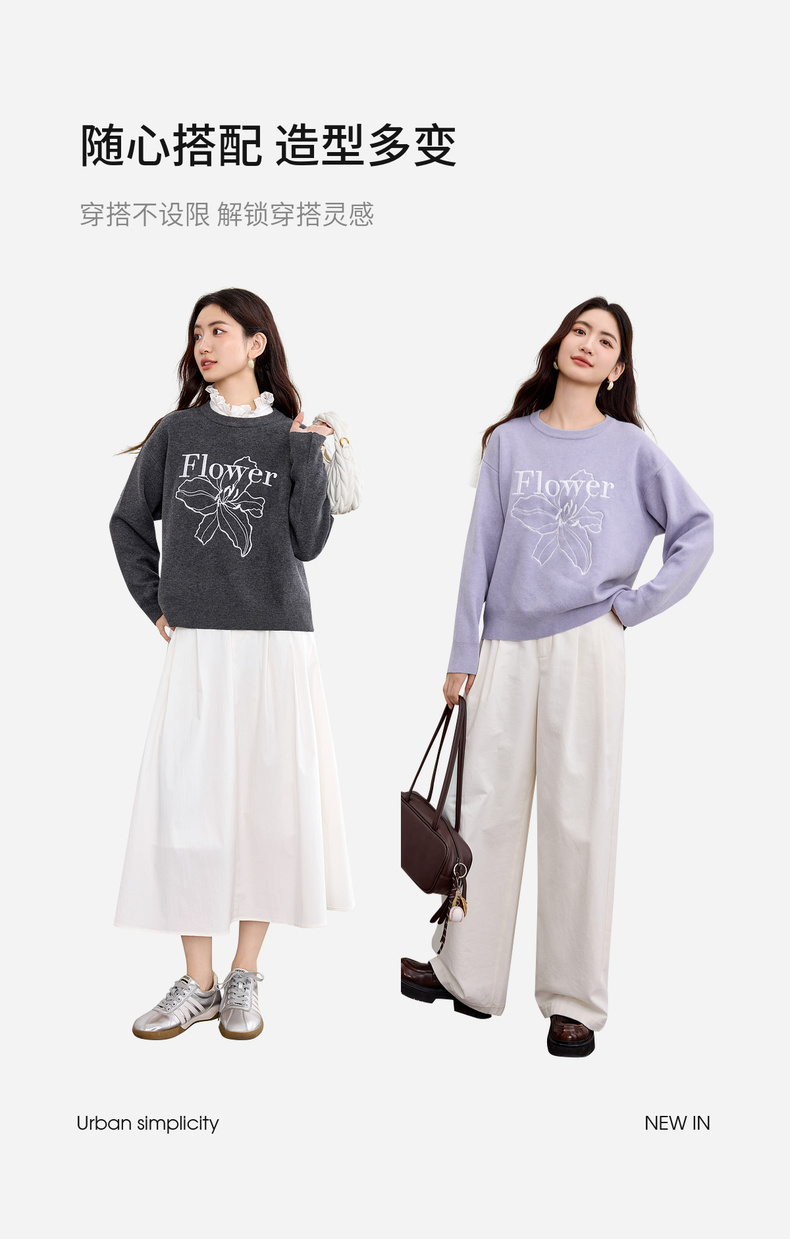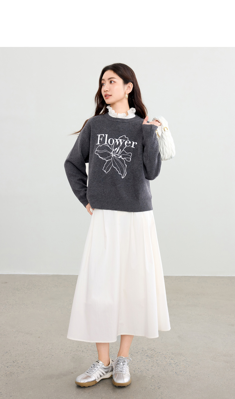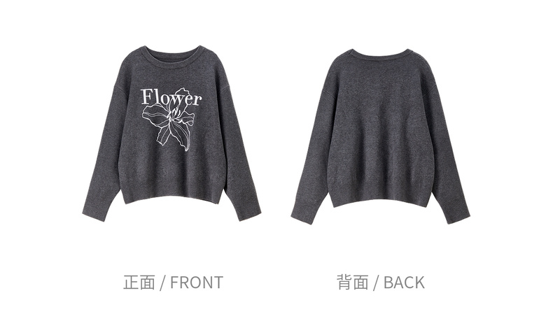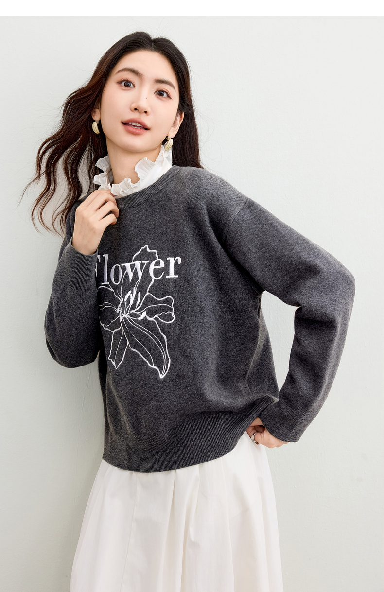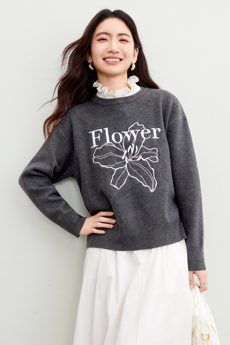 【内购】【鸢尾花】简约通勤圆领撞色字母花卉绣花宽松落肩袖软糯弹力毛衣-W53EE3374