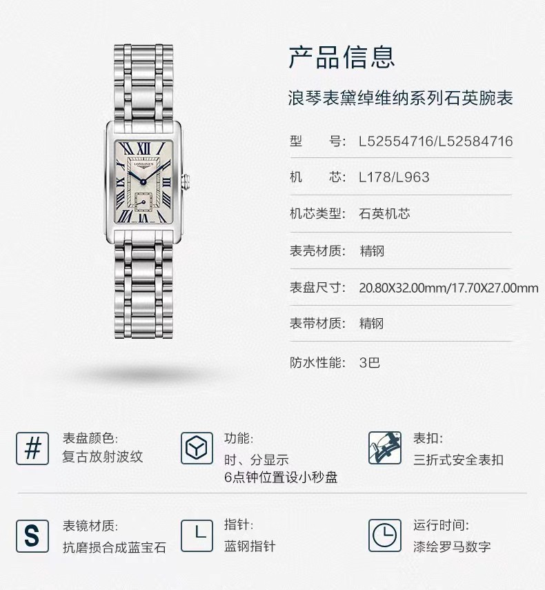 表径20.8*32mm. 抗磨损蓝宝石镜面,漆绘放射纹字面,印刷无晕染,蓝钢指针,针尖工艺均已达到市面上最高水平,316精钢壳带,打磨抛光十分漂亮,采用浪琴旗下L718原装石英机芯,来自ETA的基底,保证了产品的稳定走时,大部件原厂,算目前市面上这个表的顶配了。 选配原盒保卡,是否保修请遵循当地浪琴售后政策,不作保证,本公司承担2年全方位售后。