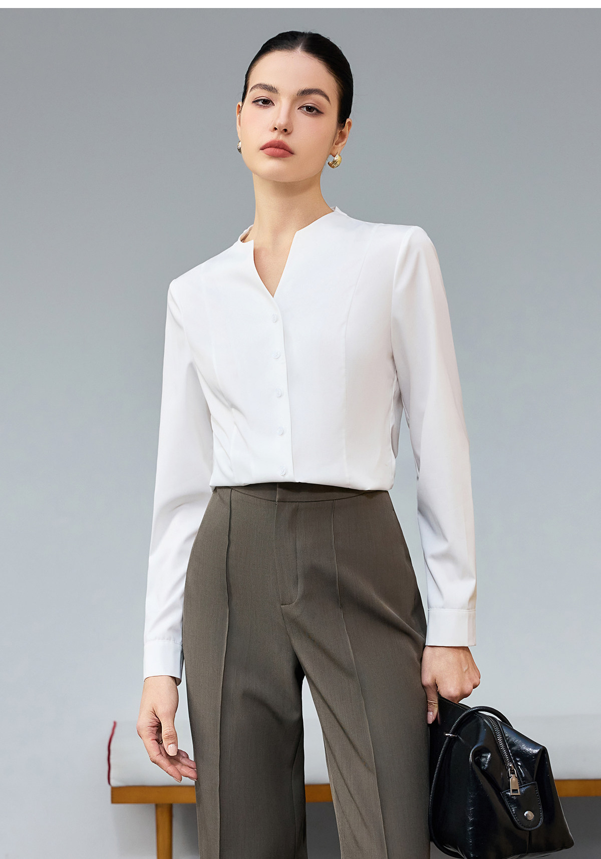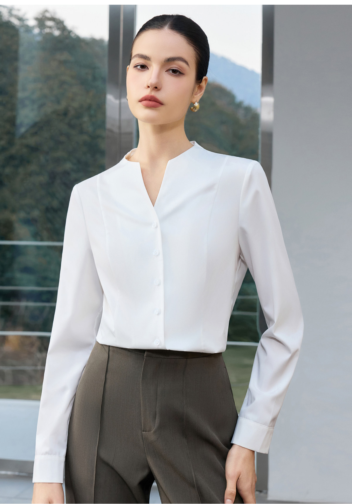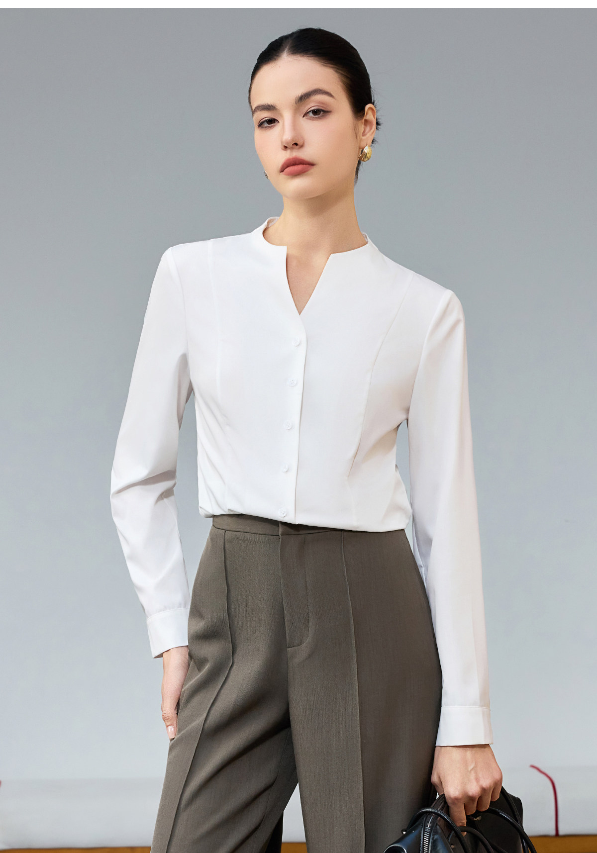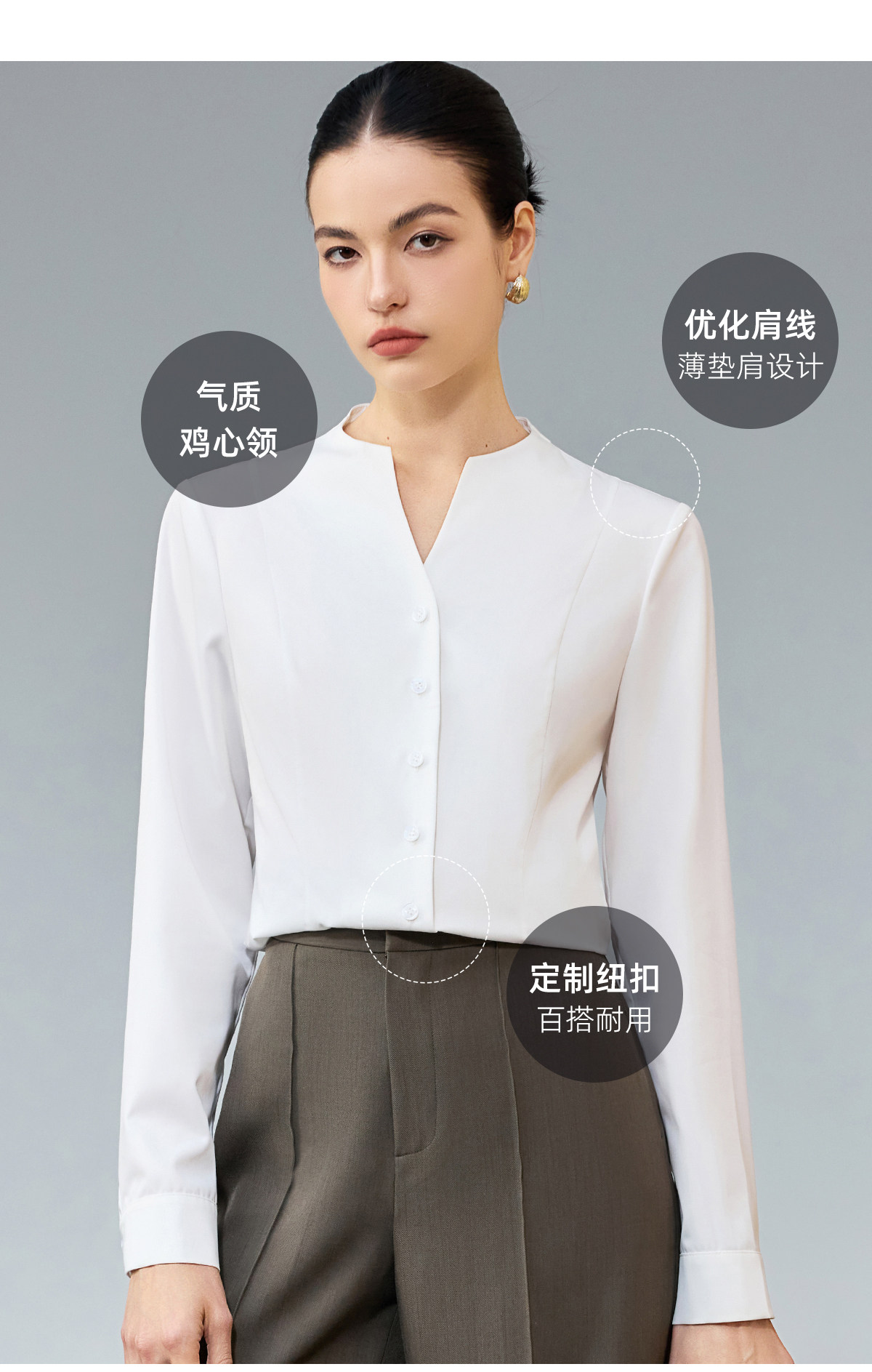 IWY/商务风白色V领衬衫女长袖职业通勤面试简约气质百搭衬衣25B945