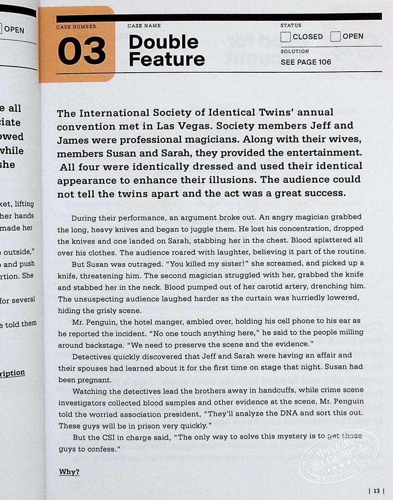 社会上坏人正在逍遥法外,只有你敏锐的逻辑感和对可疑细节的敏锐眼光才能阻止他们。作为犯罪现场调查员,你必须正确判断书中65个犯罪故事中每个故事结尾的问题的答案。在书中,你将从法医的肩膀上窥视尸体解剖的过程,你将仔细聆听工具印记专家的证词,你将评估所有摆在你面前的血淋淋的细节,直到你确信你能解决这个难题。每个犯罪故事都将考验你对DNA分析、嫌疑人识别、法医病理学、毒理学等方面的知识。