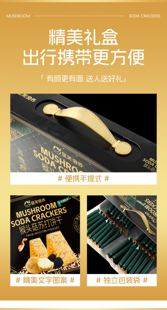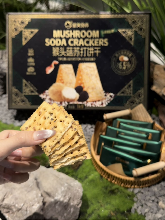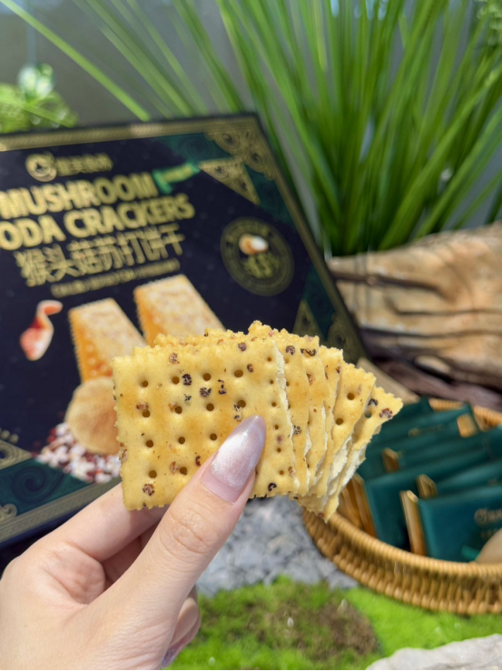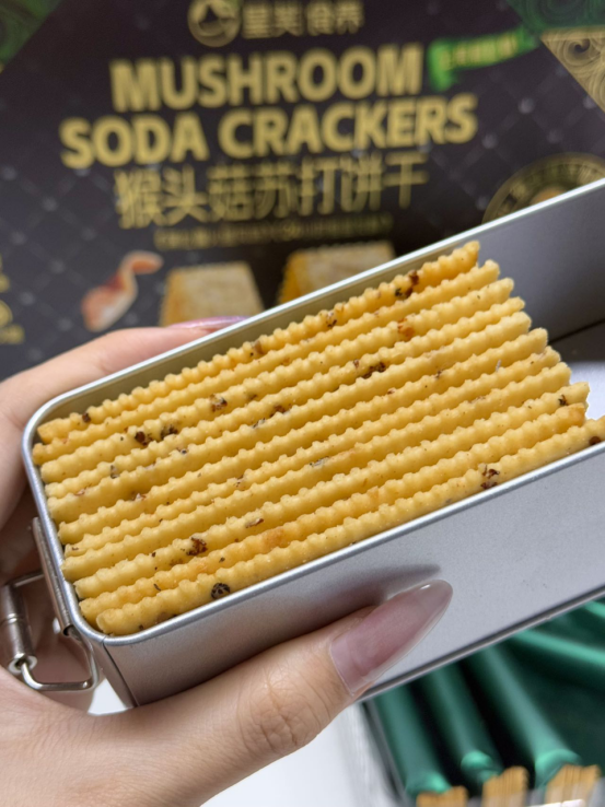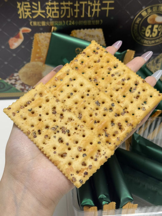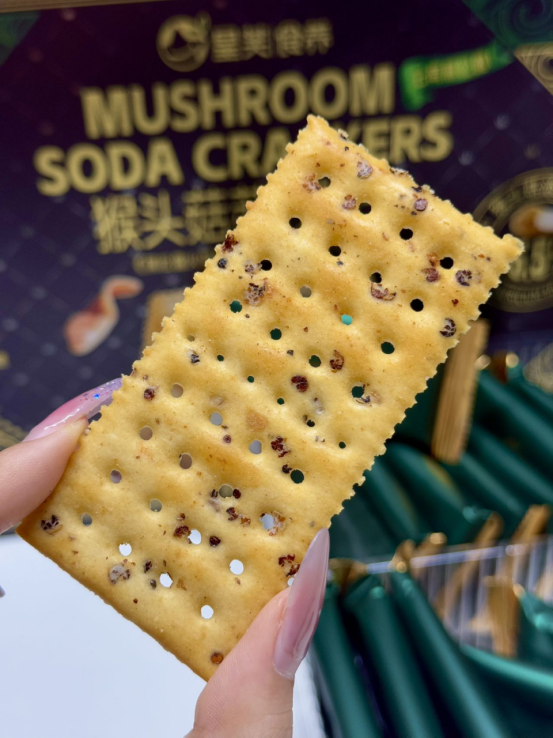 酥脆可口:继承了苏打饼干的酥脆口感,咬下去 “咔嚓” 一声,口感清爽, 不会给人油腻感,能带来良好的咀嚼体验。独特风味: 巧妙融合了猴头菇的鲜美与咸香味道,形成独特的风味,每一口都充满层次感,让人回味无穷。