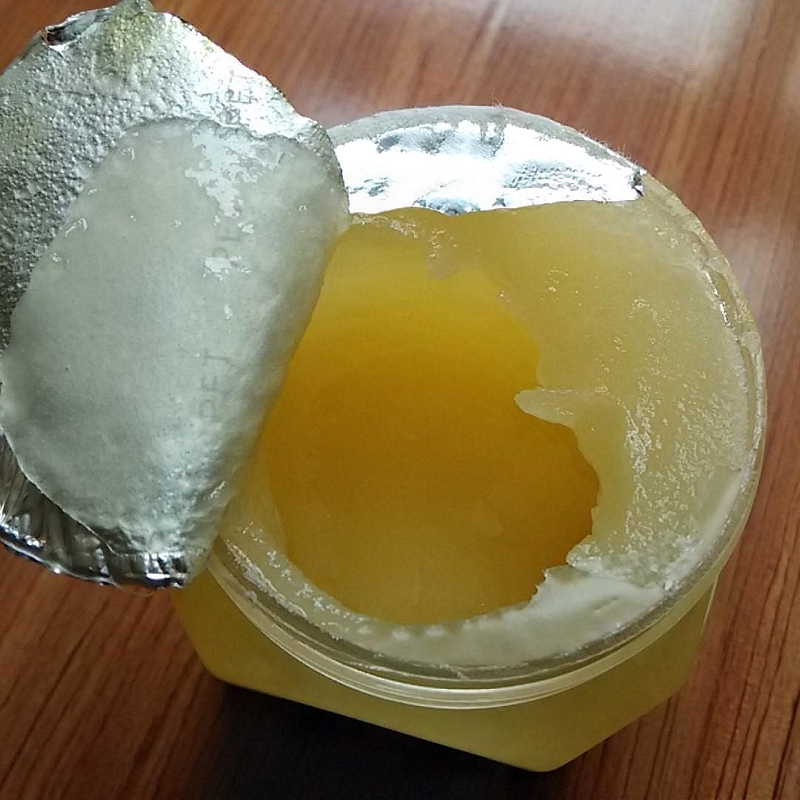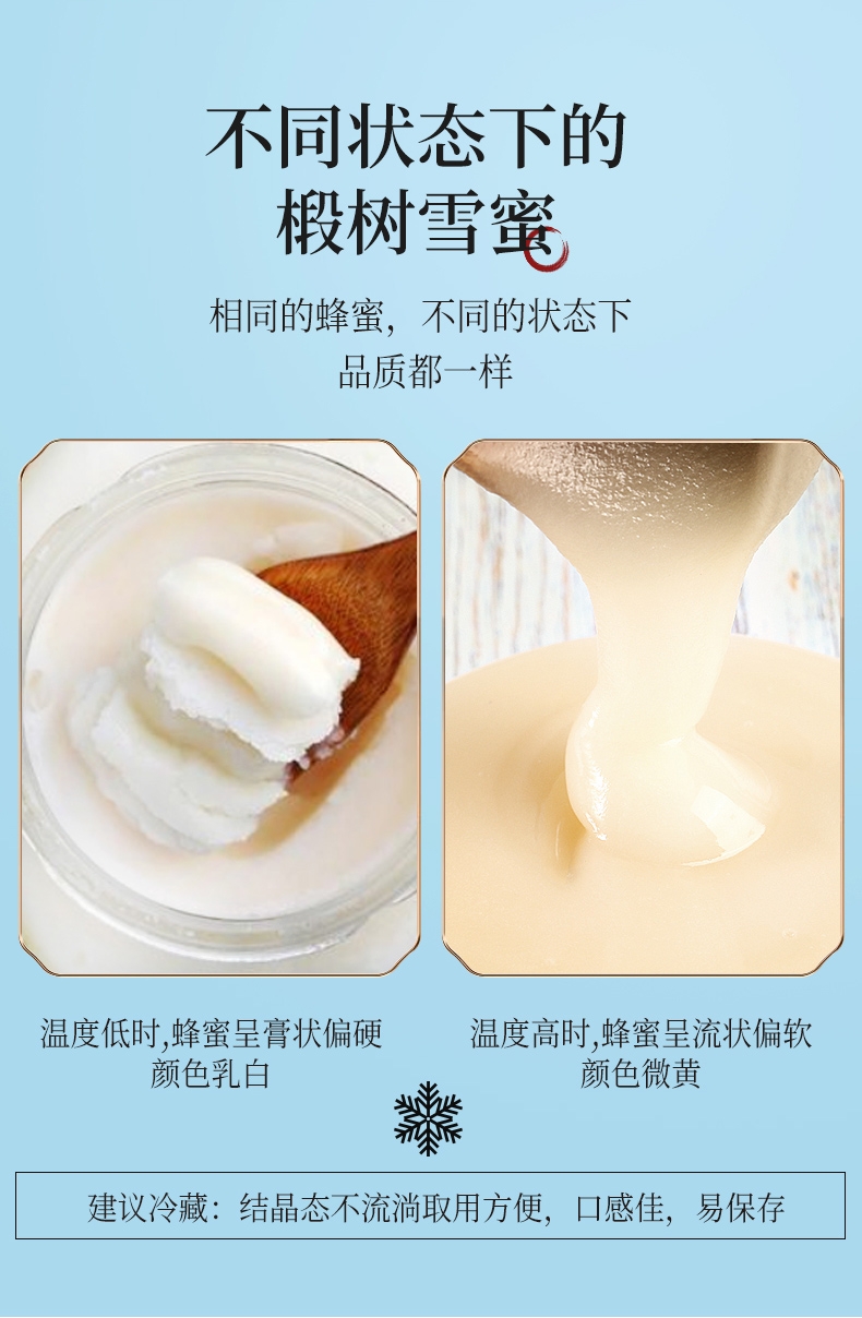 (上图)椴树蜜天气冷时结晶颜色为浅白色,温度转暖后变为浅黄色,均为正常情况,建议冰箱冷藏,持续保持固体状态,方便食用。