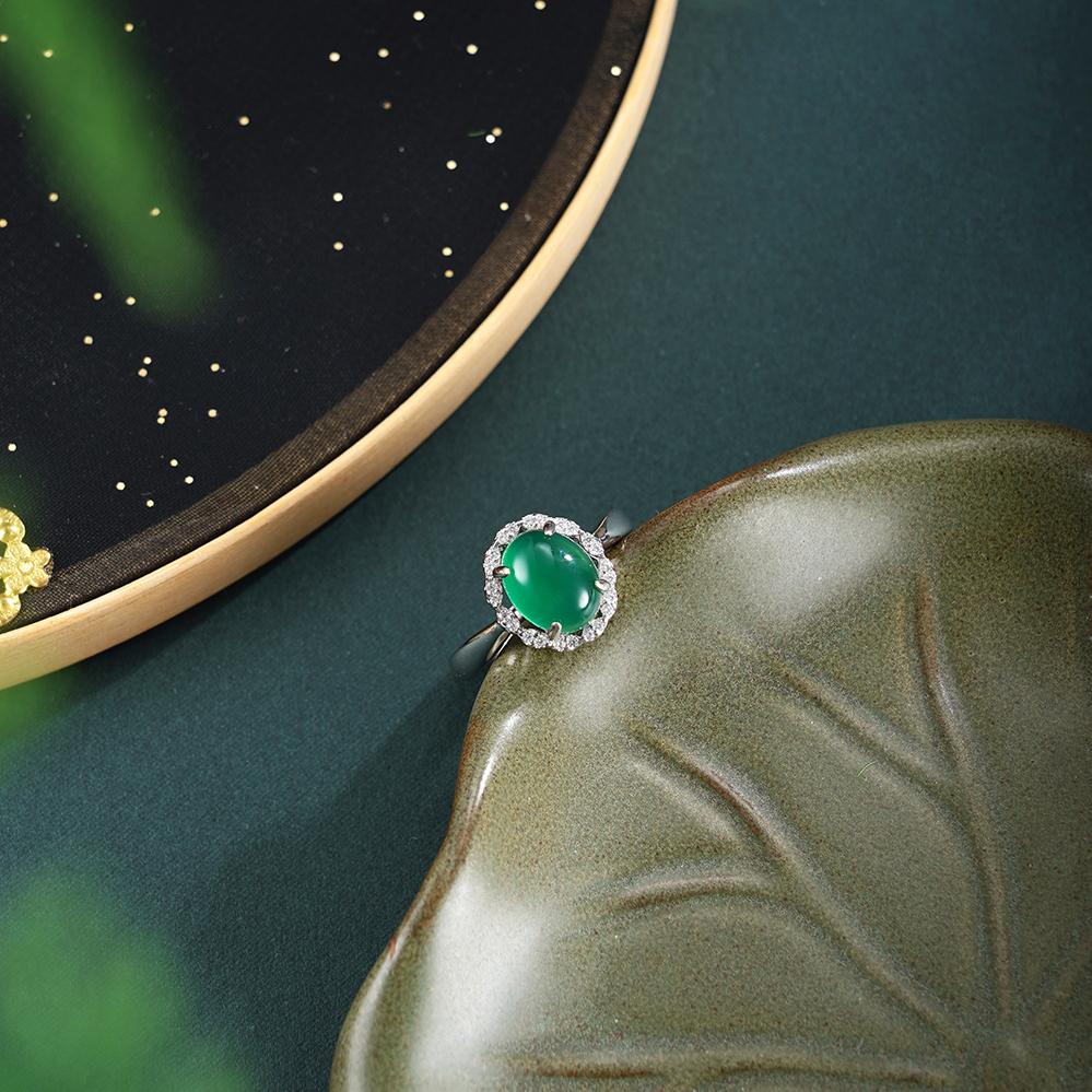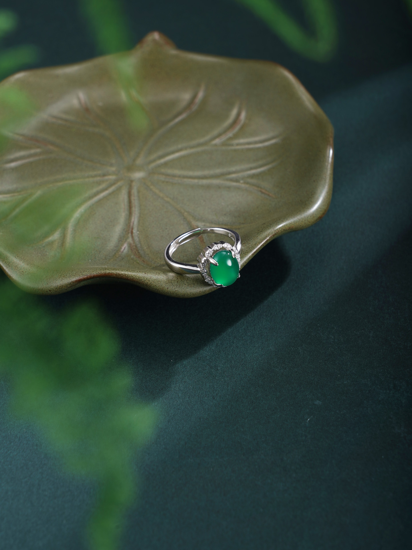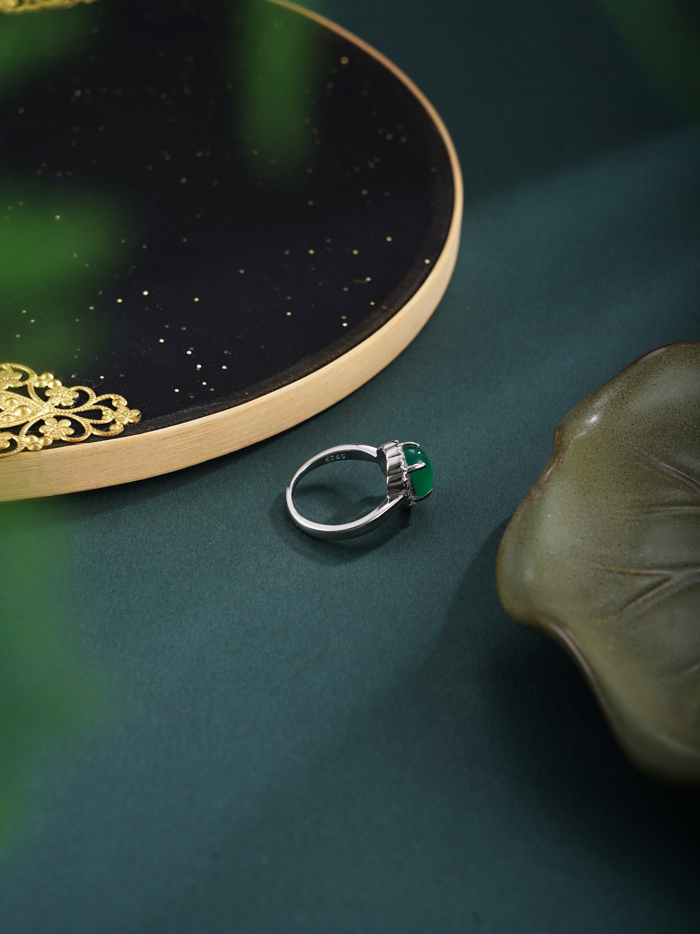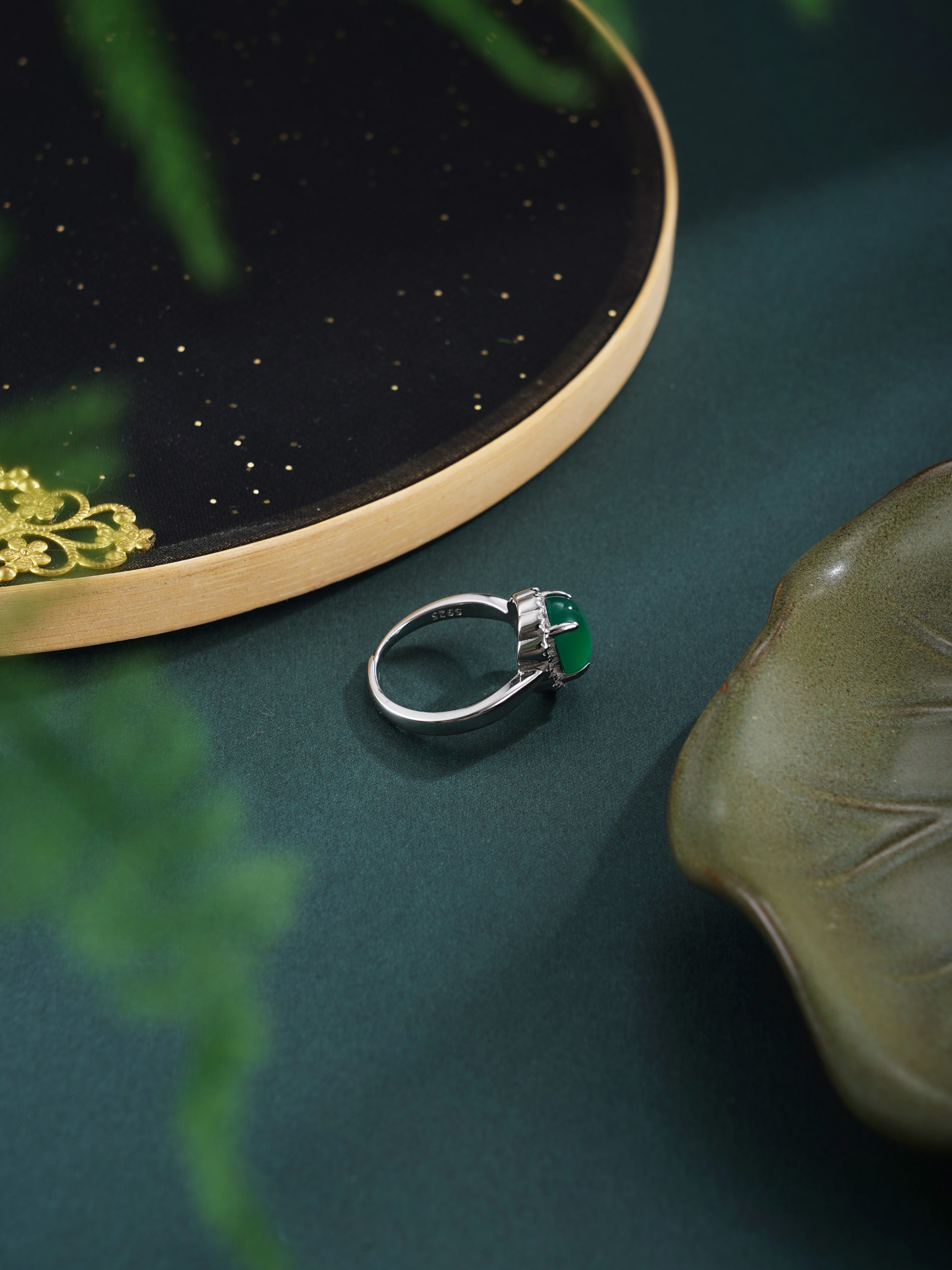 【寓意】:纯银戒指镶嵌蛋面绿玉髓,如春日新芽破土而生,暗合“春风得意马蹄疾”的昂扬意趣,赋予佩戴者一份可触可感的蓬勃生机。寓意春风化雨,意气如虹。