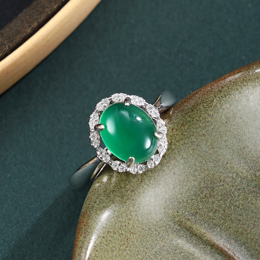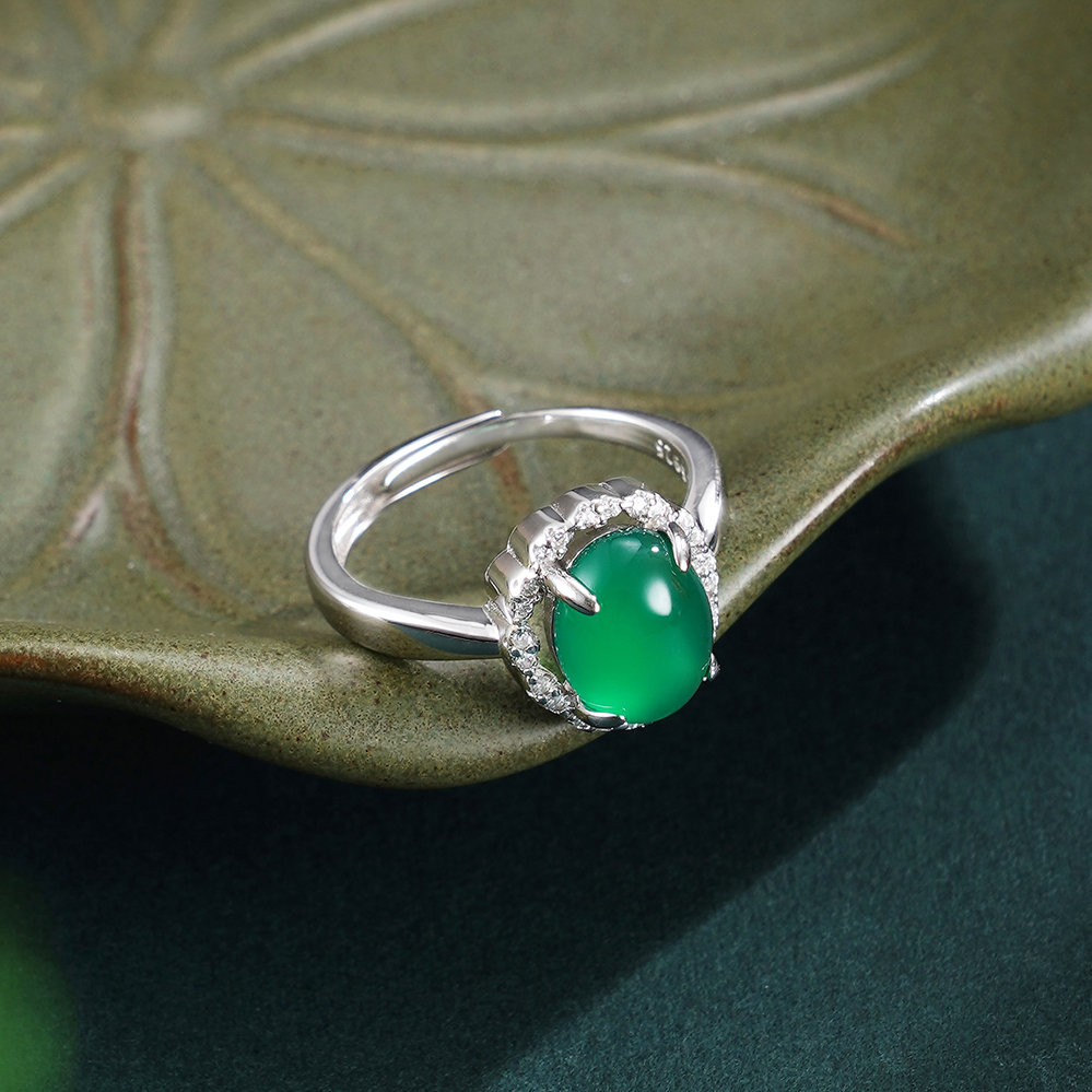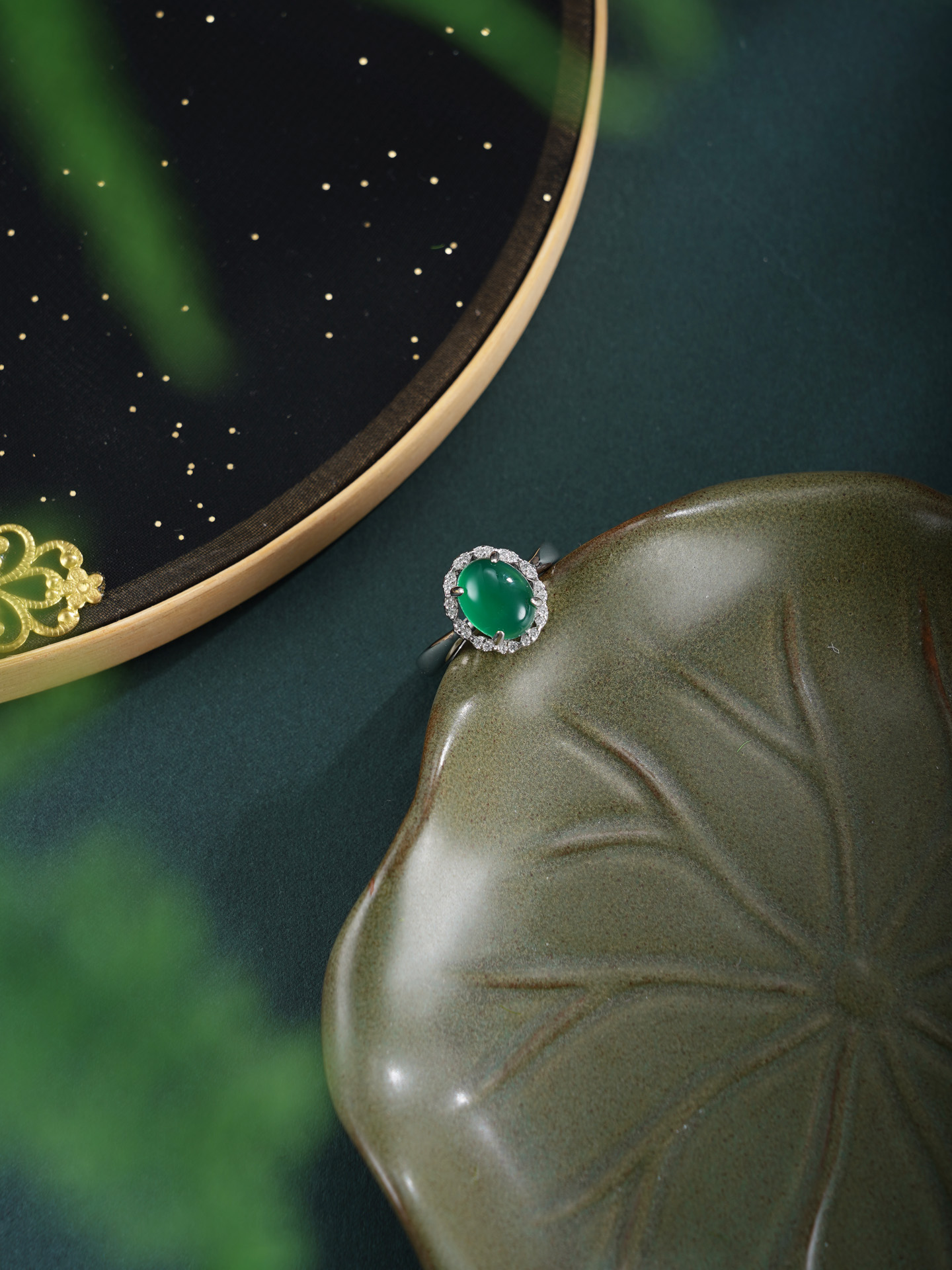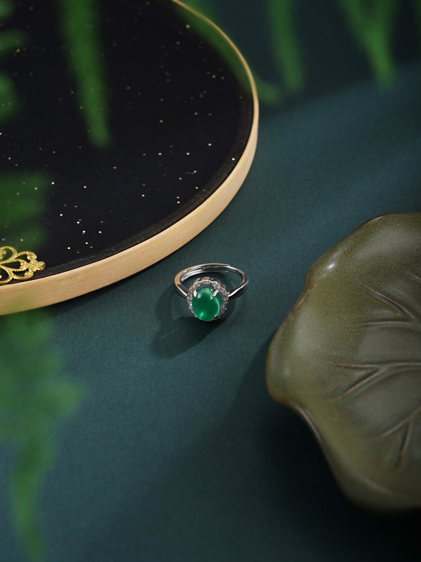 【寓意】:纯银戒指镶嵌蛋面绿玉髓,如春日新芽破土而生,暗合“春风得意马蹄疾”的昂扬意趣,赋予佩戴者一份可触可感的蓬勃生机。寓意春风化雨,意气如虹。