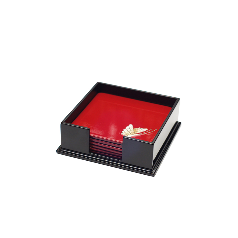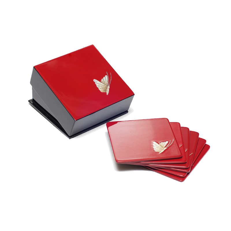 复古典雅的红漆杯垫上,彩绘蝴蝶元素。