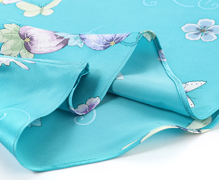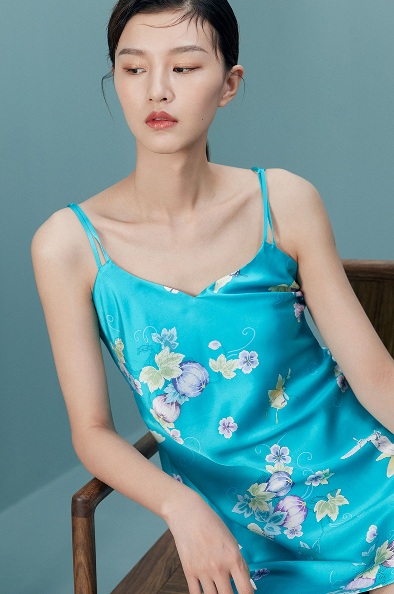 采用桑蚕丝面料,质地光滑柔软且富有光泽,穿着轻薄飘逸,宽松舒适,整体浪漫大气,时尚休闲。