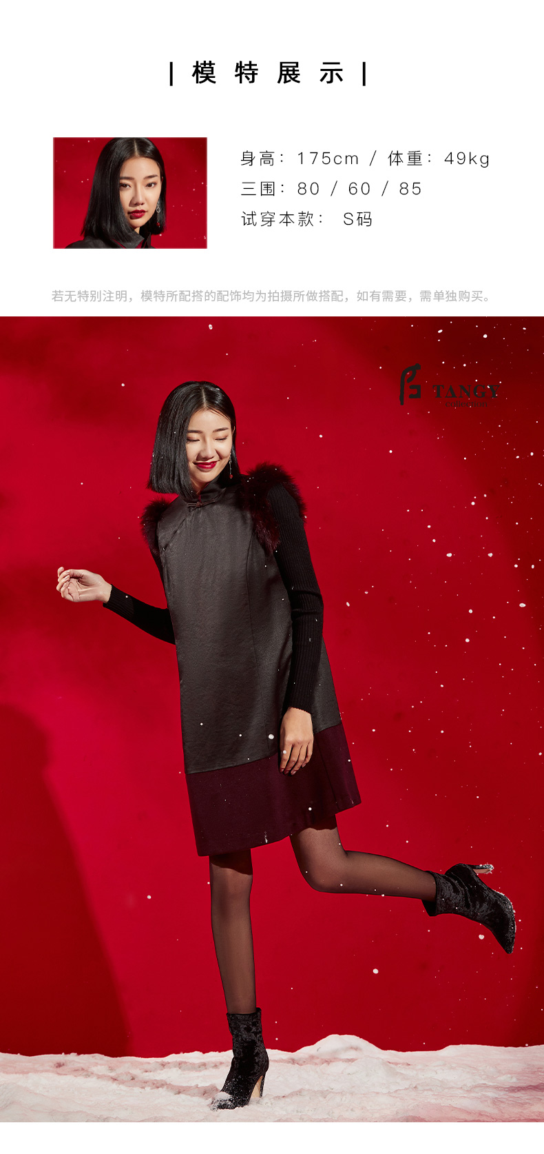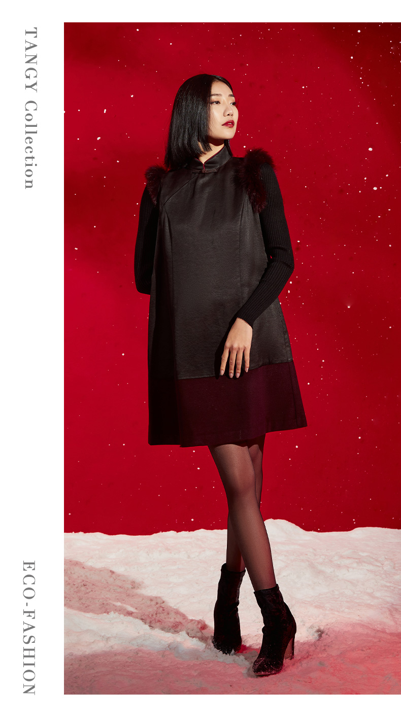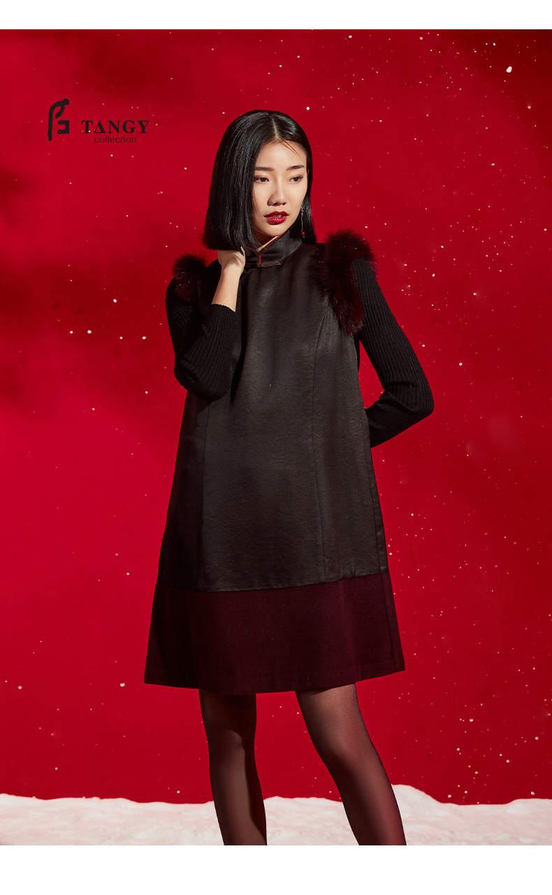 TANGY Collection/天意精品秋冬新品丝毛拼接国风立领旗袍连衣裙