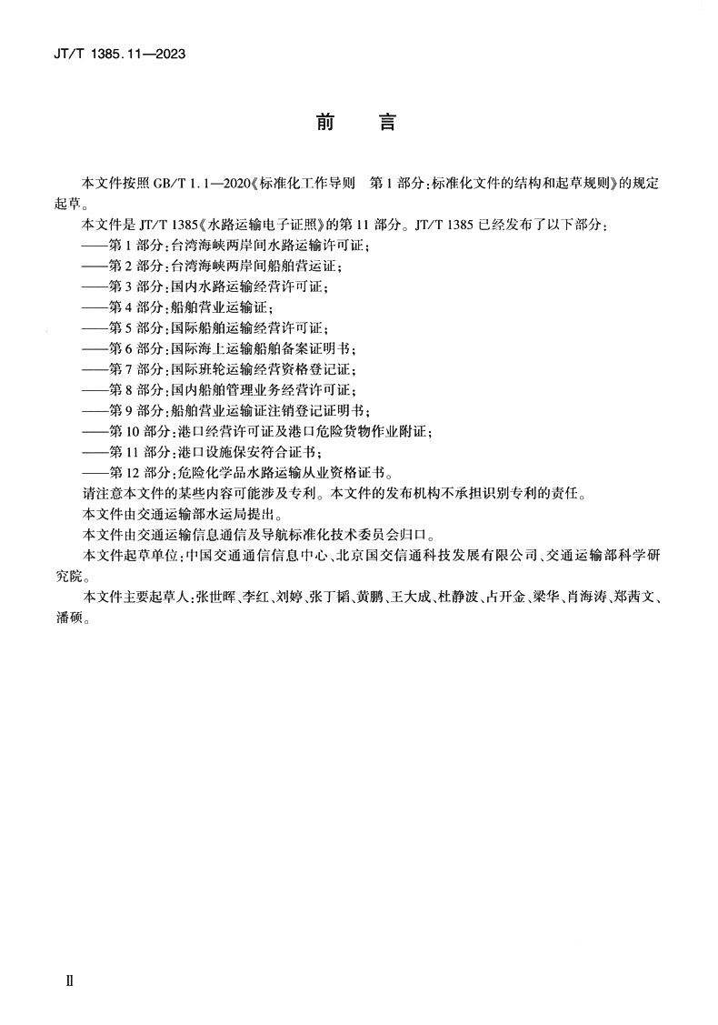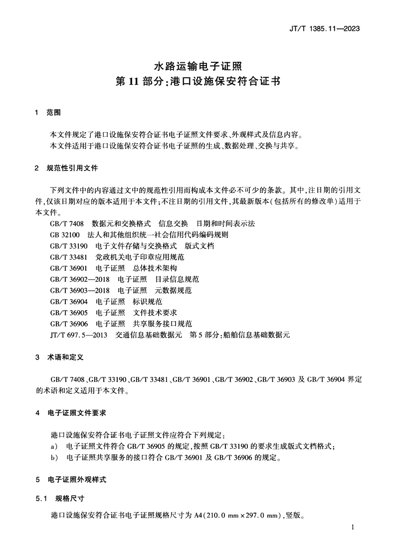书名:水路运输电子证照 第11部分:港口设施保安符合证书(JT/T 1385.11—2023)