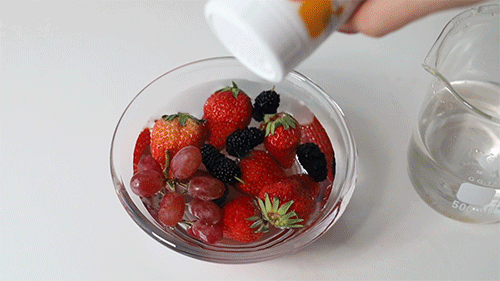 洗水果洗菜洗肉时,倒3-4下进盆里(约2g),浸泡后,倒掉脏水,再用清水冲洗一遍就好!