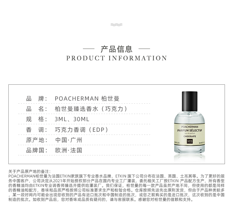柏世曼巧克力味香水 香甜美食调持久淡香学生女士香水