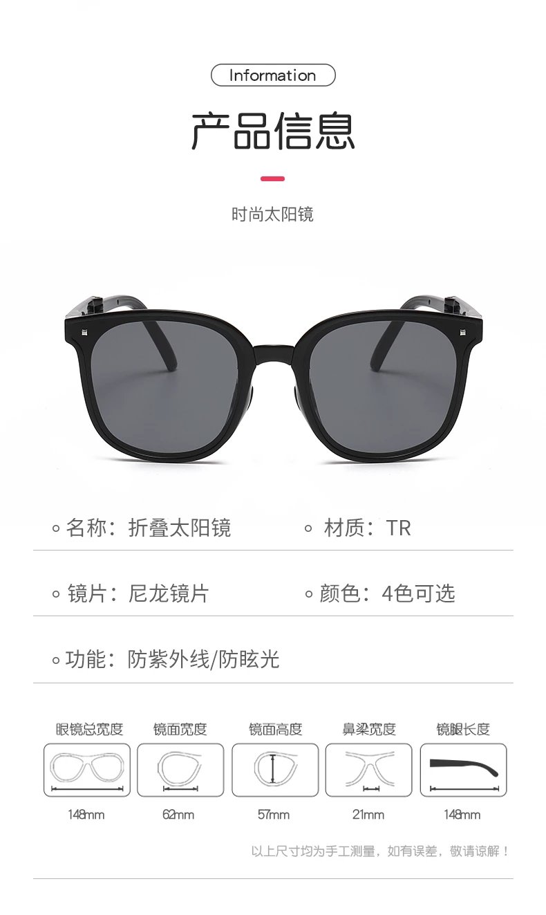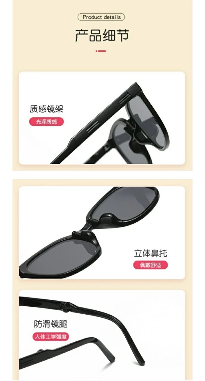 【产品名称】骊佳高清太阳镜时尚折叠墨镜82037款 【产地】重庆 【发货地】浙江台州 【发货物流】韵达、中通快递,邮政 【发货时效】48小时内发出 【包邮地区】全国包邮 【邮费设置】港澳台不发货,疫情地区以官方通报为准 【关于售后退换要求】7天无理由退换货(不能影响2次销售),非品质问题退换货要支付寄回运费 【拦截拒收是否收费】否 【产品卖点】文艺、清新、轻盈时尚 【生产日期】2022.11月生产 【保质期】6个月 【成分】TR、硅胶、尼龙 【使用禁忌】无