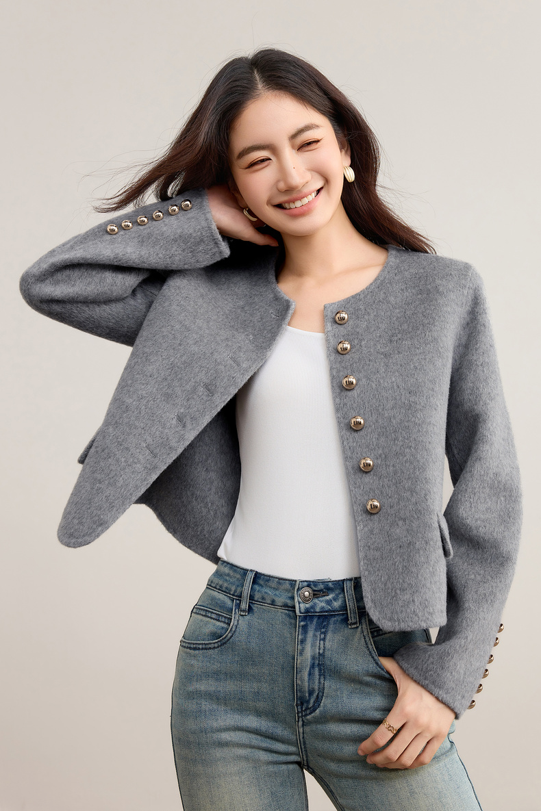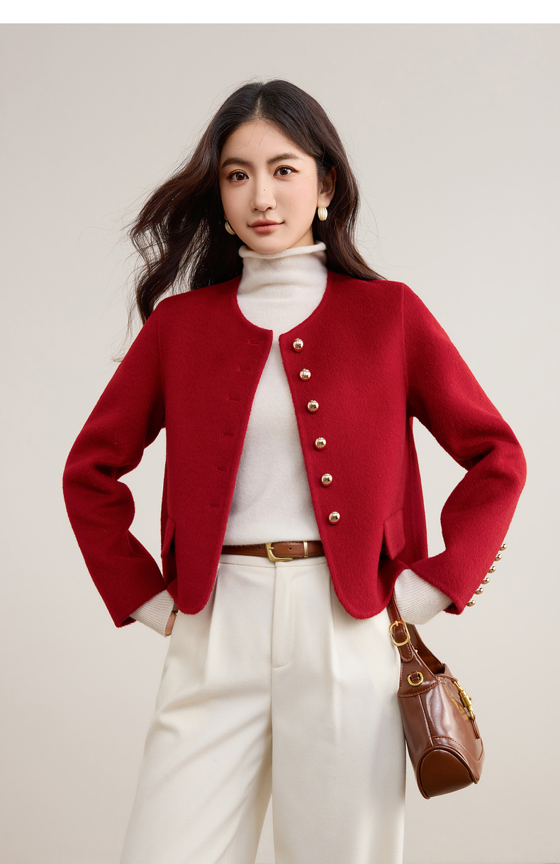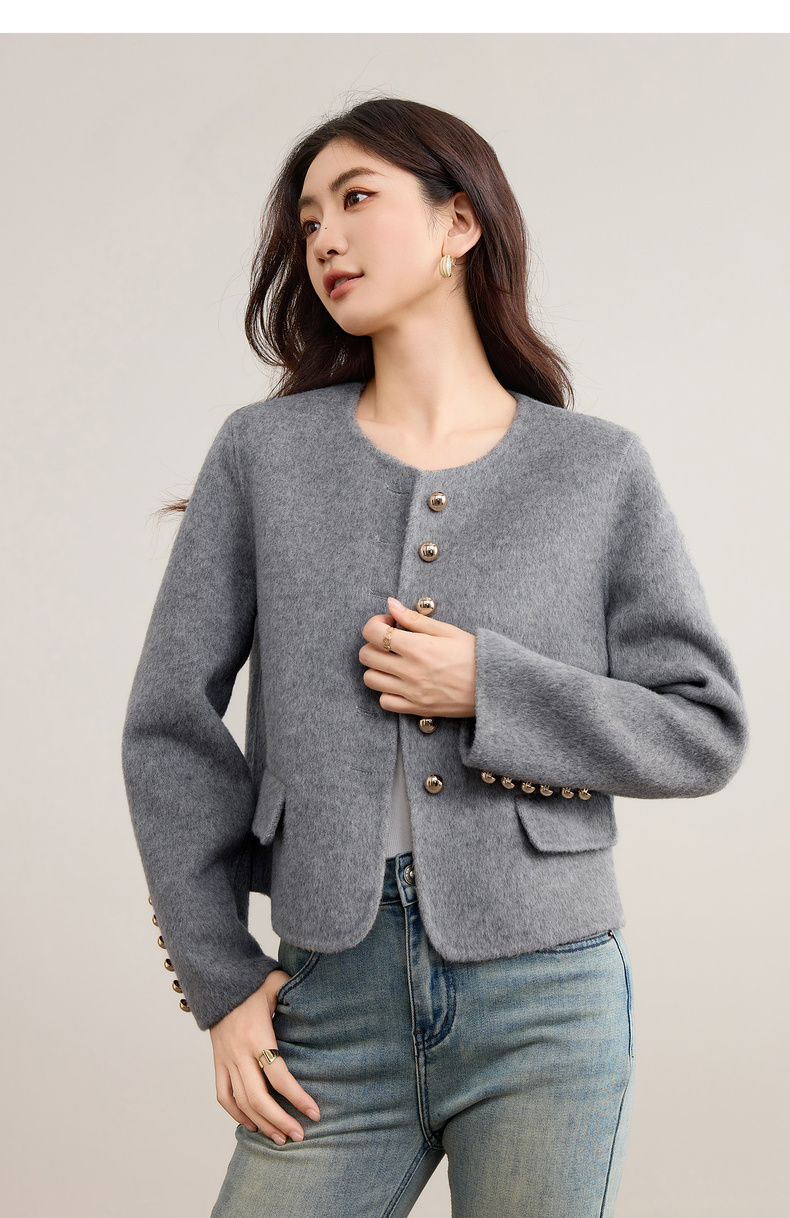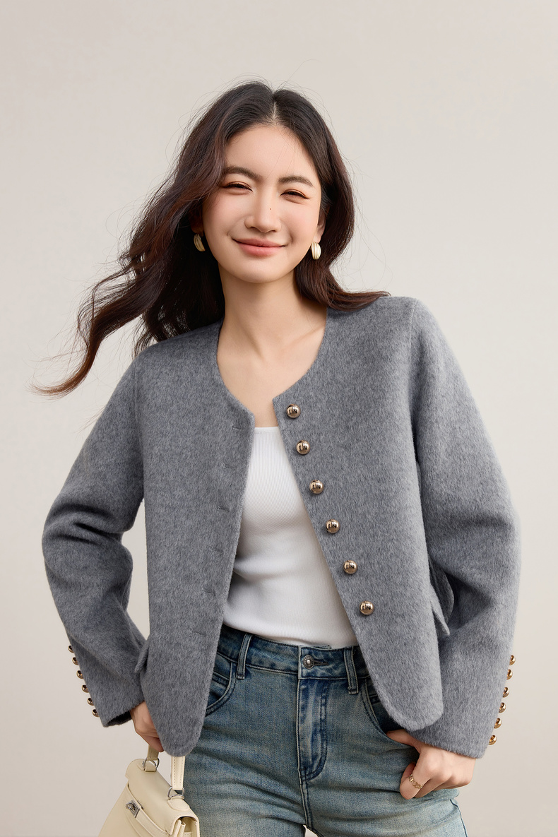 【内购】【100%绵羊毛】优雅气质通勤圆领金属蘑菇扣长袖厚保暖双面呢外套-W54OG3691X