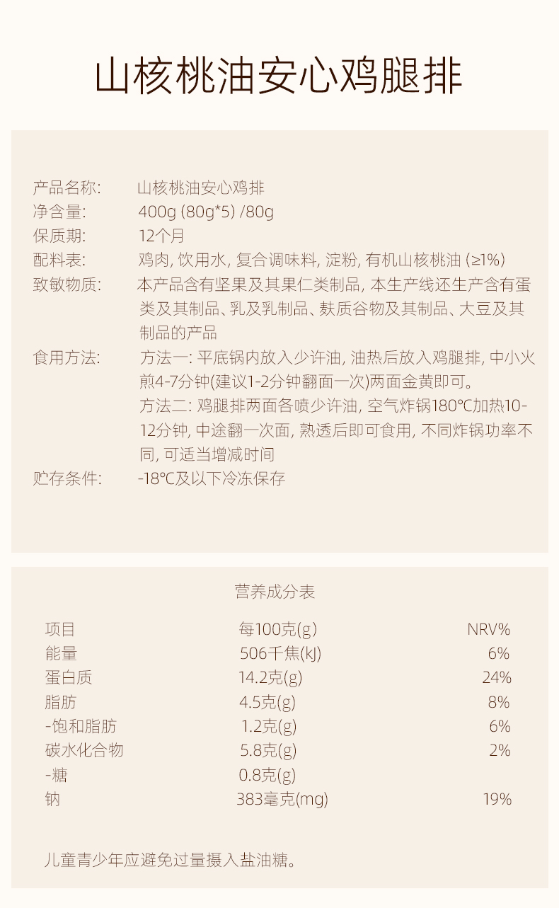 【限时活动!下单多赠1片鸡腿排!】自由肉肉 山核桃油鸡腿排 400g(80g*5片)谷物慢养鸡 可溯源 秦岭有机山核桃油锁汁 口感鲜嫩 独立包装