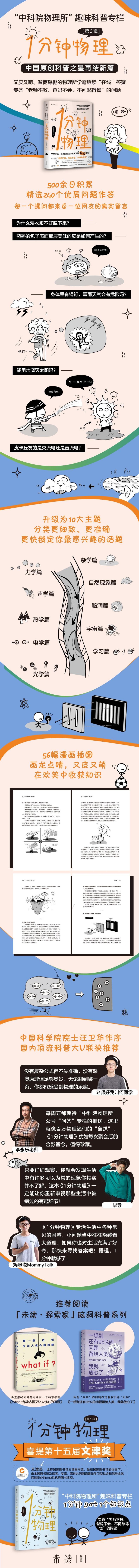 《1分钟物理(第1辑)》推出之后,在中科院物理所官方公众号的后台,百万订阅粉丝继续源源不断地提出各种五花八门的问题,这些问题有的来自生活场景中的突发之问,有的来自课堂上不会讲的“超纲”内容,依然往往是“爸妈不会、老师不教,不问还憋得慌”的问题。如:为什么湿衣服不好脱下来?人老了会又近视又老花吗?手机是如何测剩余电量的?能用水浇灭太阳吗?皮卡丘发的是交流电还是直流电?……啥问题都敢接招的“物理君”每周五都会定期回答读者们的这些“灵魂之问”。于是一年下来,其中的精华又集结成了这本《1分钟物理(第2辑)》。本辑内容由之前的5个主题升级为10大版块,涵盖声、光、电、热、宇宙、自然、脑洞等方方面面,不论喜欢还是痛恨、向往还是害怕物理的你都能get到属于你的知识点。