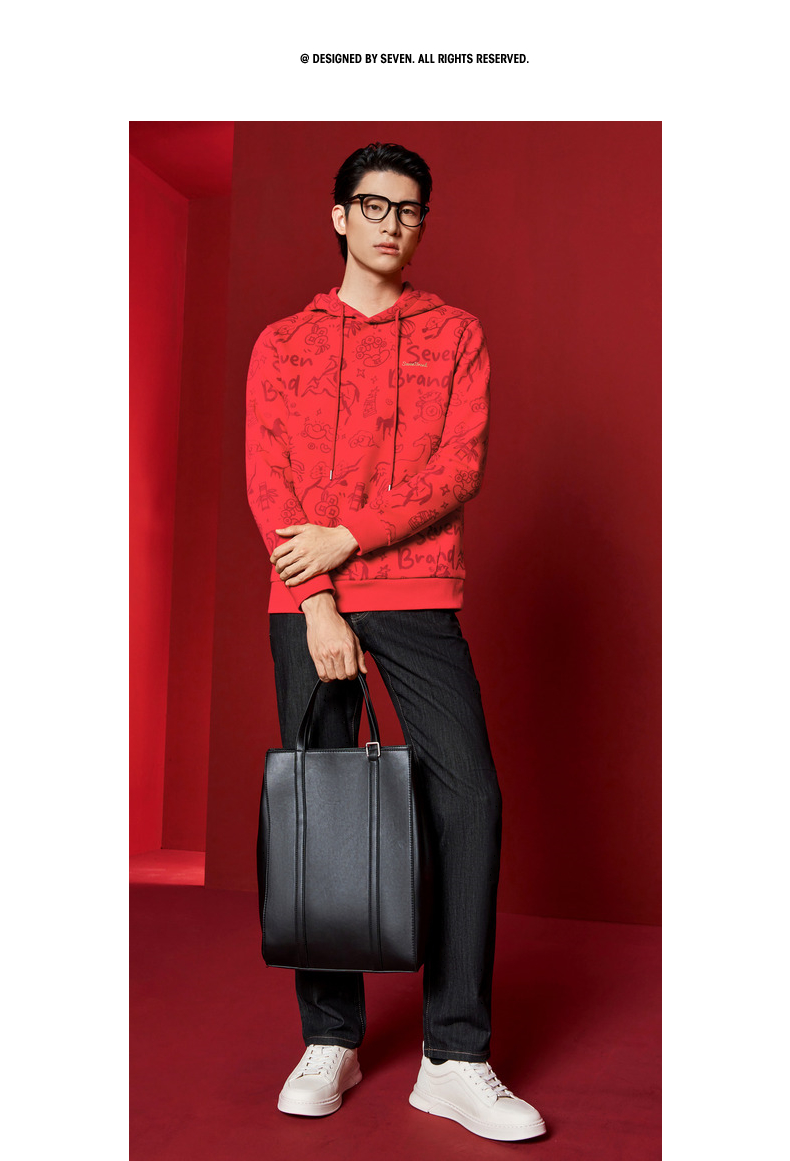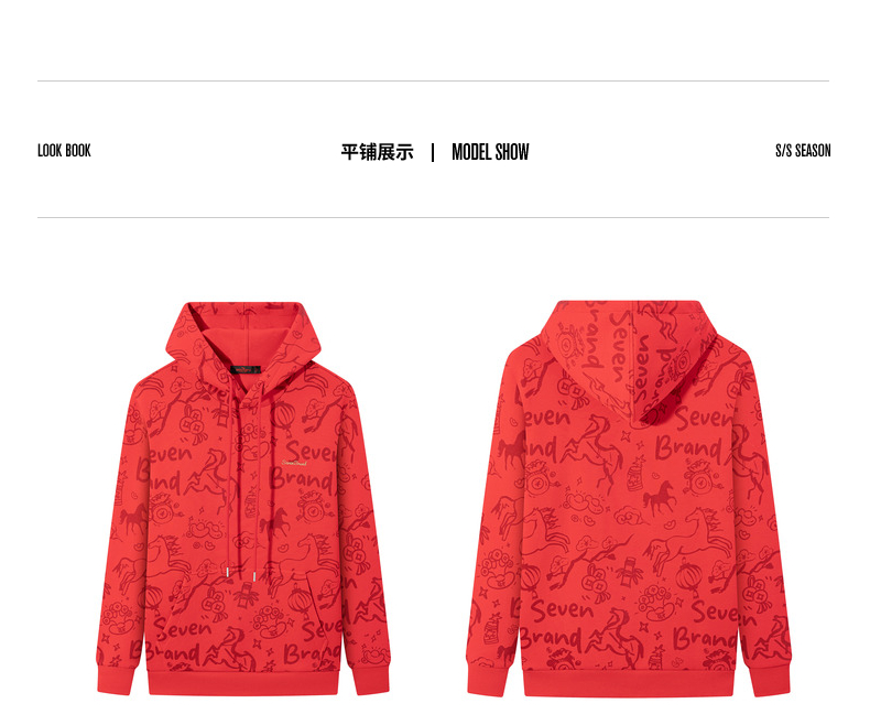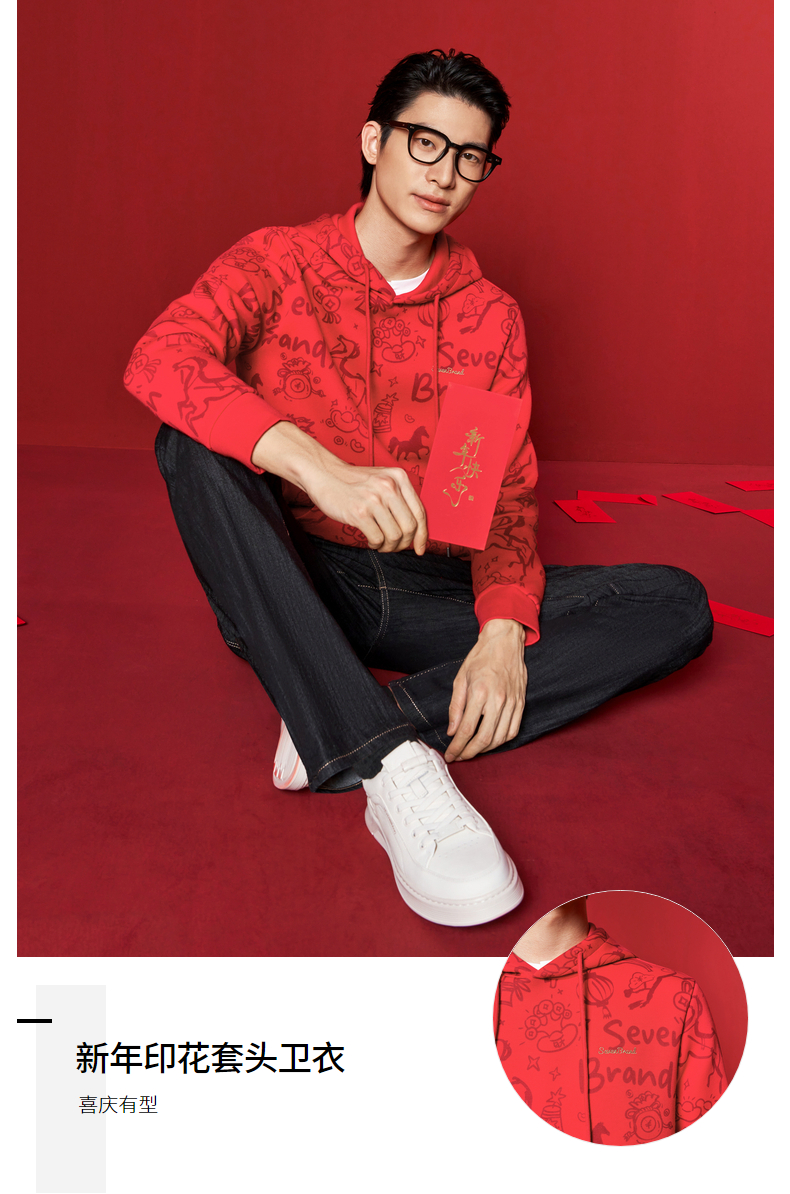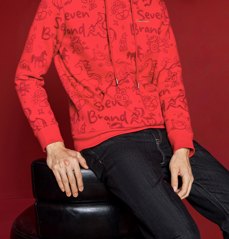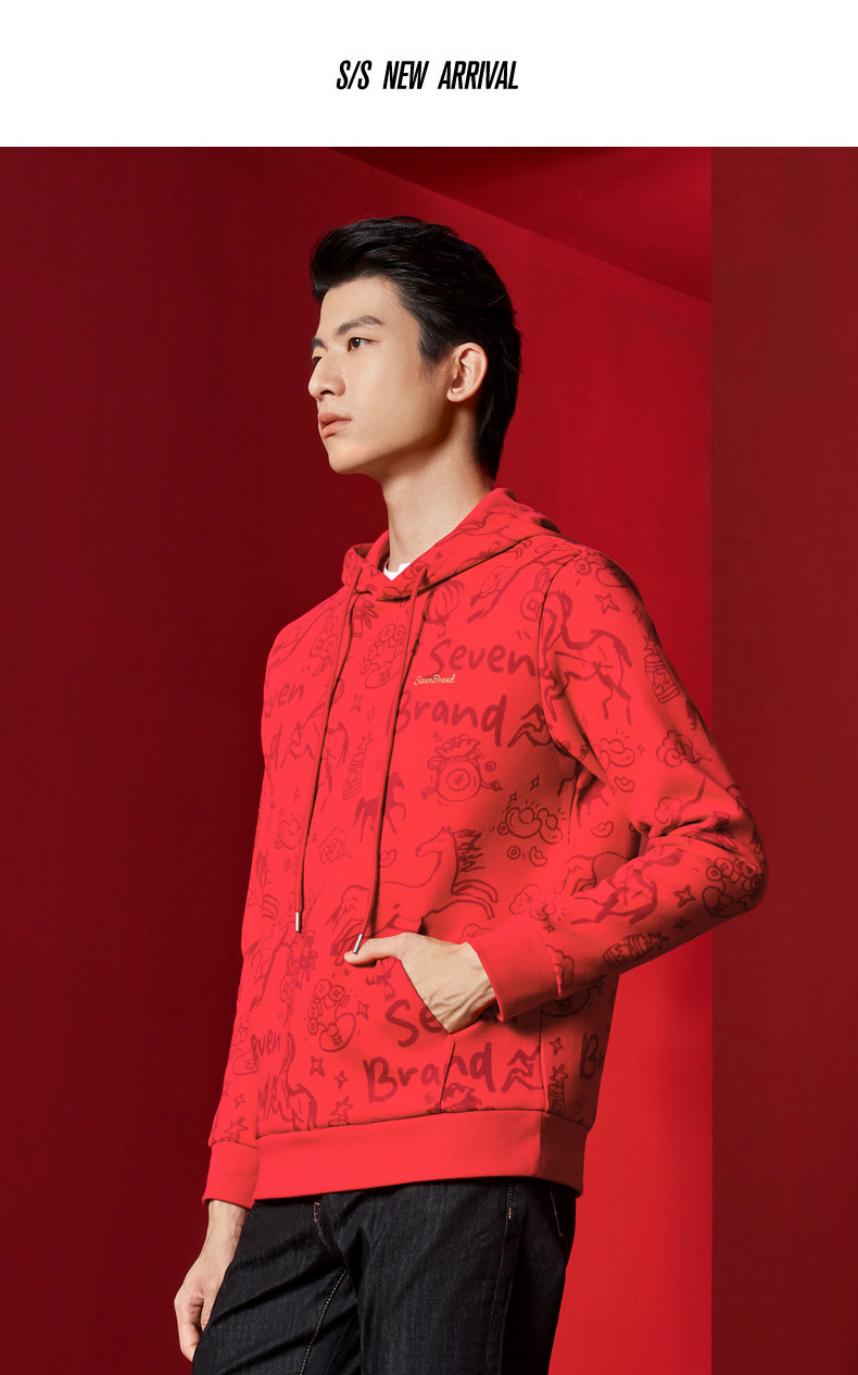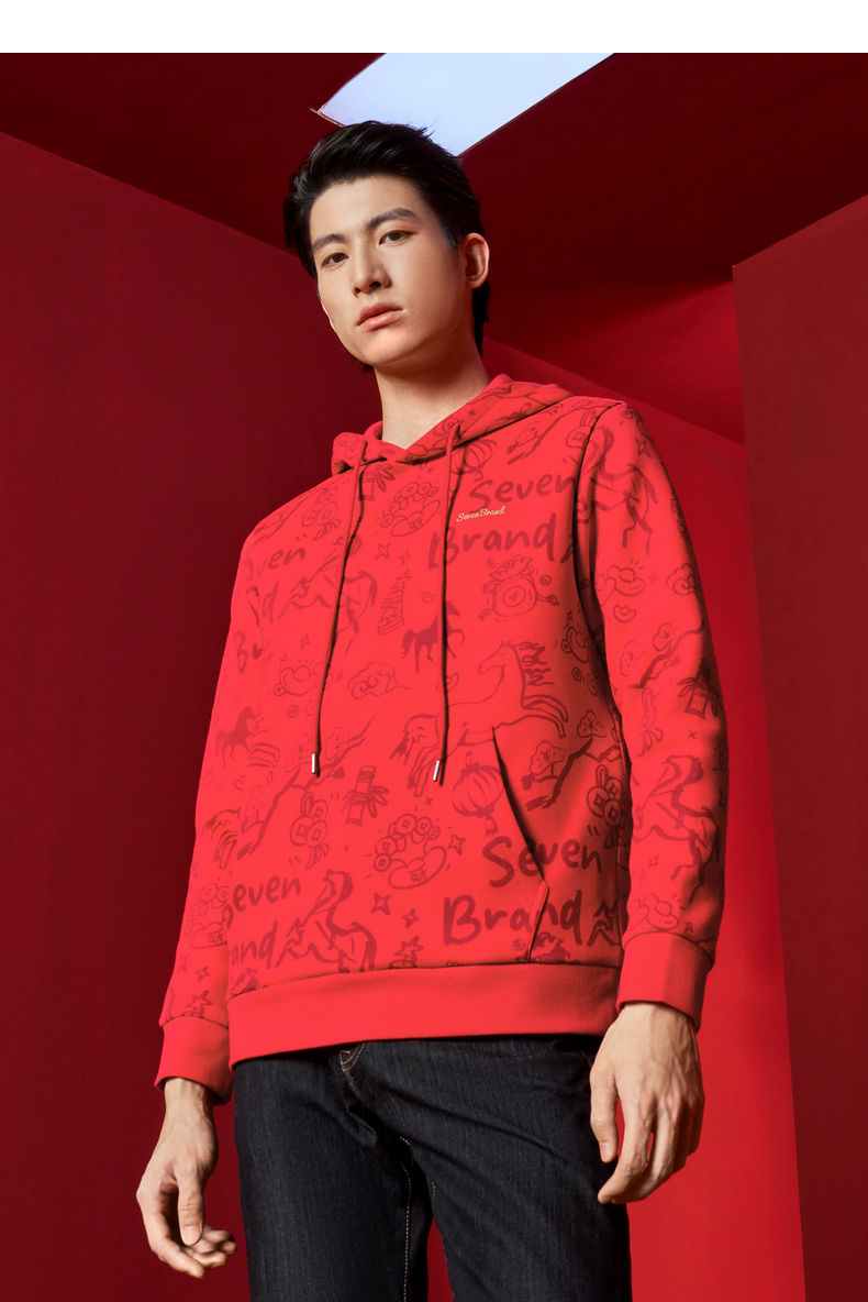 【新年系列】柒牌男装2026帽领弹力厚满印刺绣新疆棉长袖套头卫衣130W70040