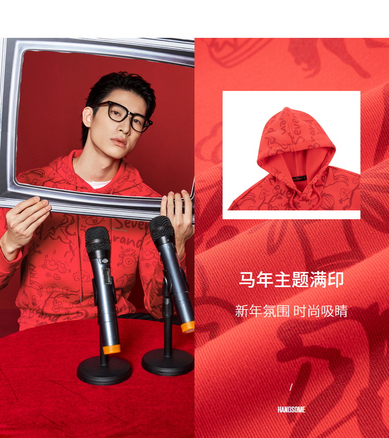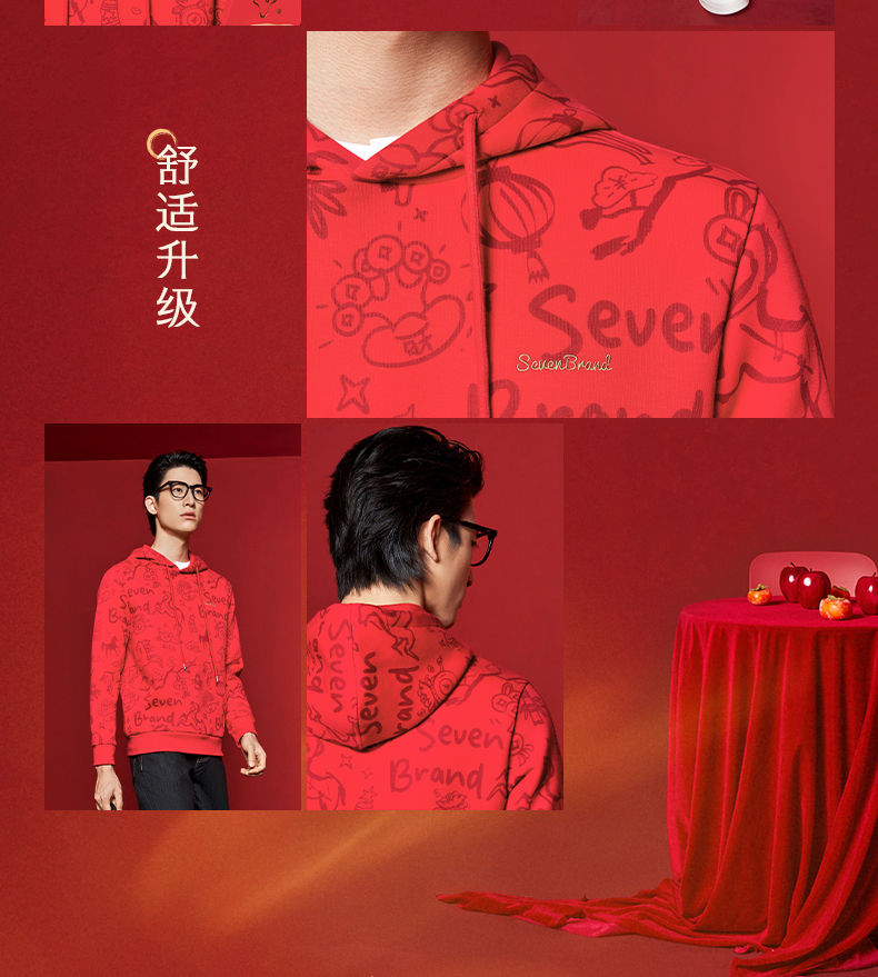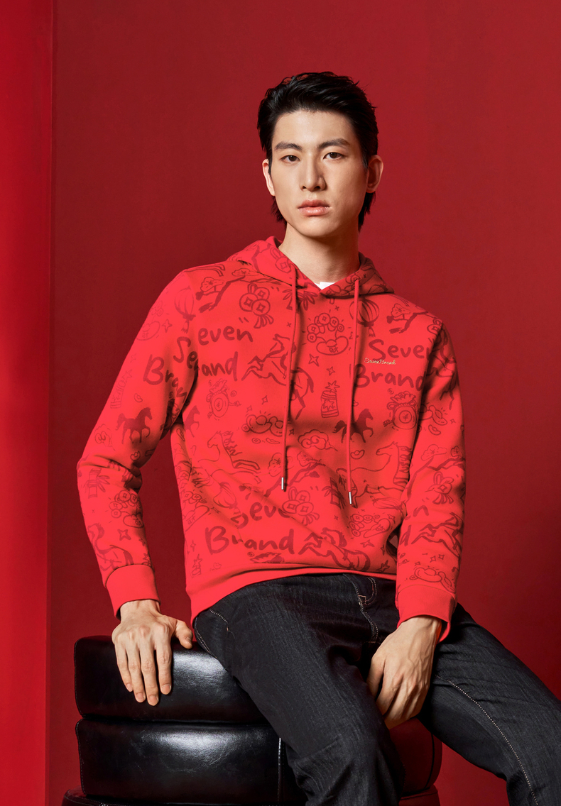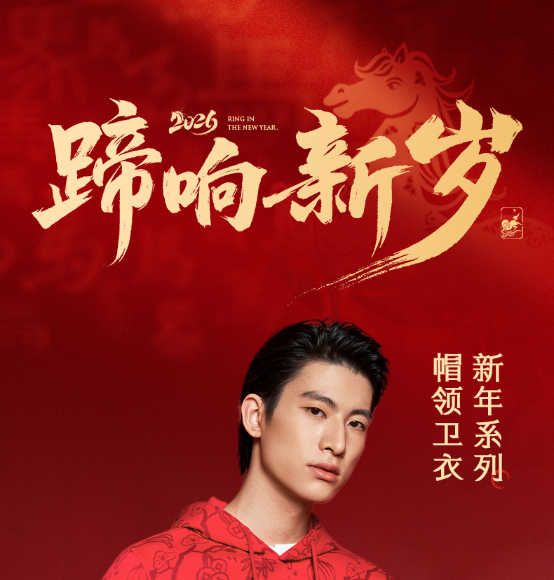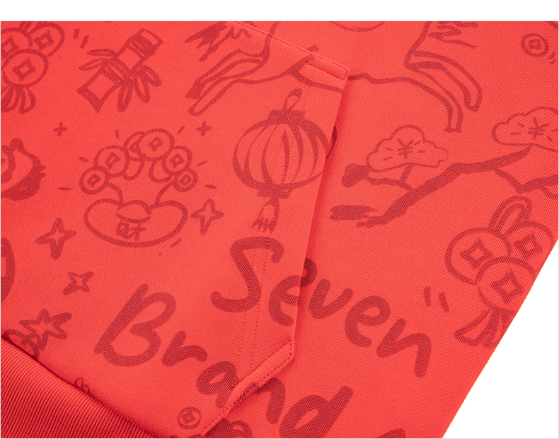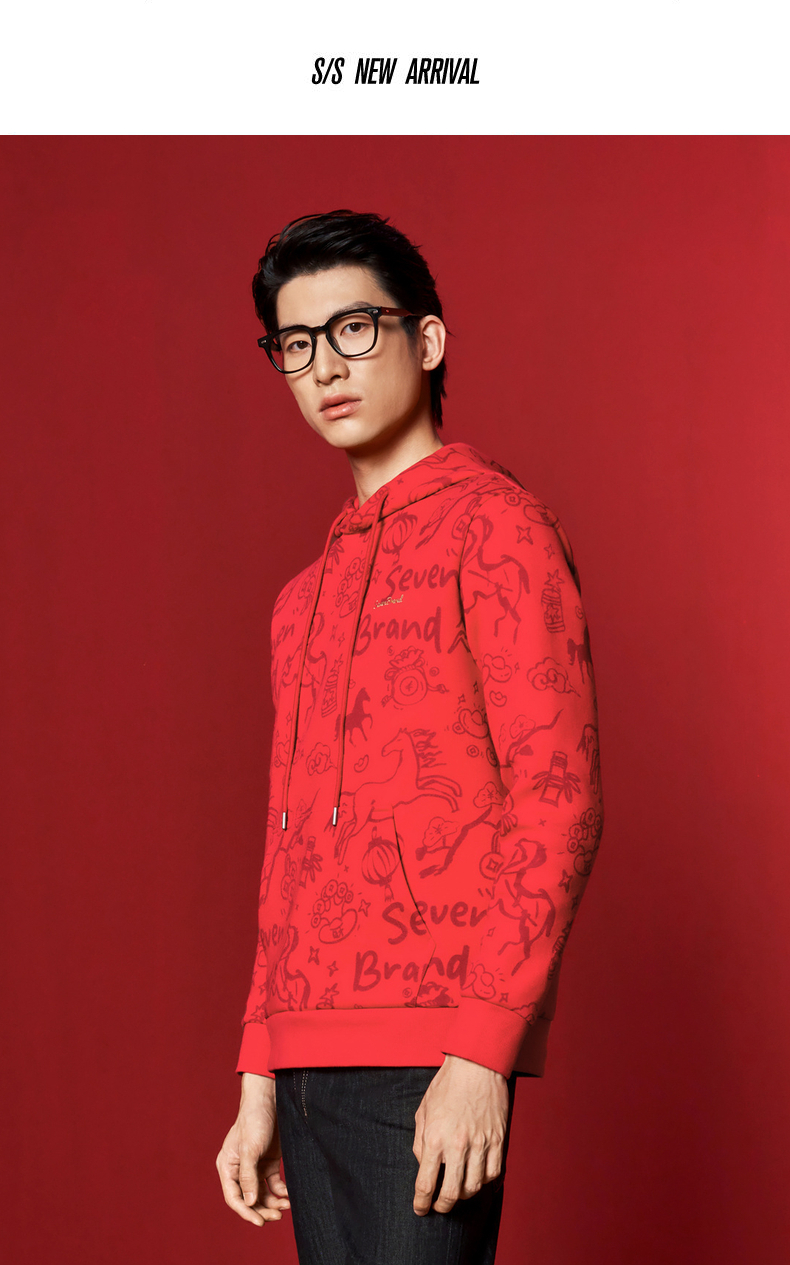 【新年系列】柒牌男装2026帽领弹力厚满印刺绣新疆棉长袖套头卫衣130W70040